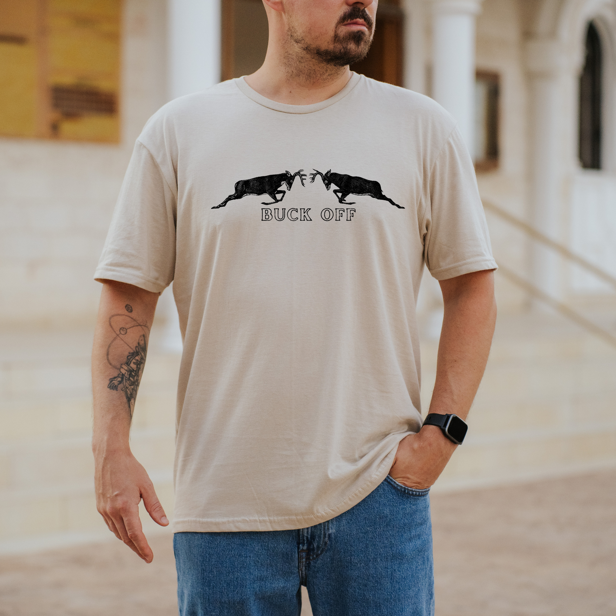 Make a bold statement with our “Buck Off” deer graphic tee featuring two hand-sketched bucks ramming antlers in a rugged, western-inspired design. This funny deer shirt blends outdoor humor with rustic style, perfect for hunters, ranch lovers, and anyone who appreciates wildlife and a little attitude. Professionally screenprinted for a soft feel and long-lasting wear, this graphic tee is built for everyday comfort. Whether you're heading to hunting camp, a country concert, or just living that small-town life, this buck off shirt brings grit and personality to your wardrobe.