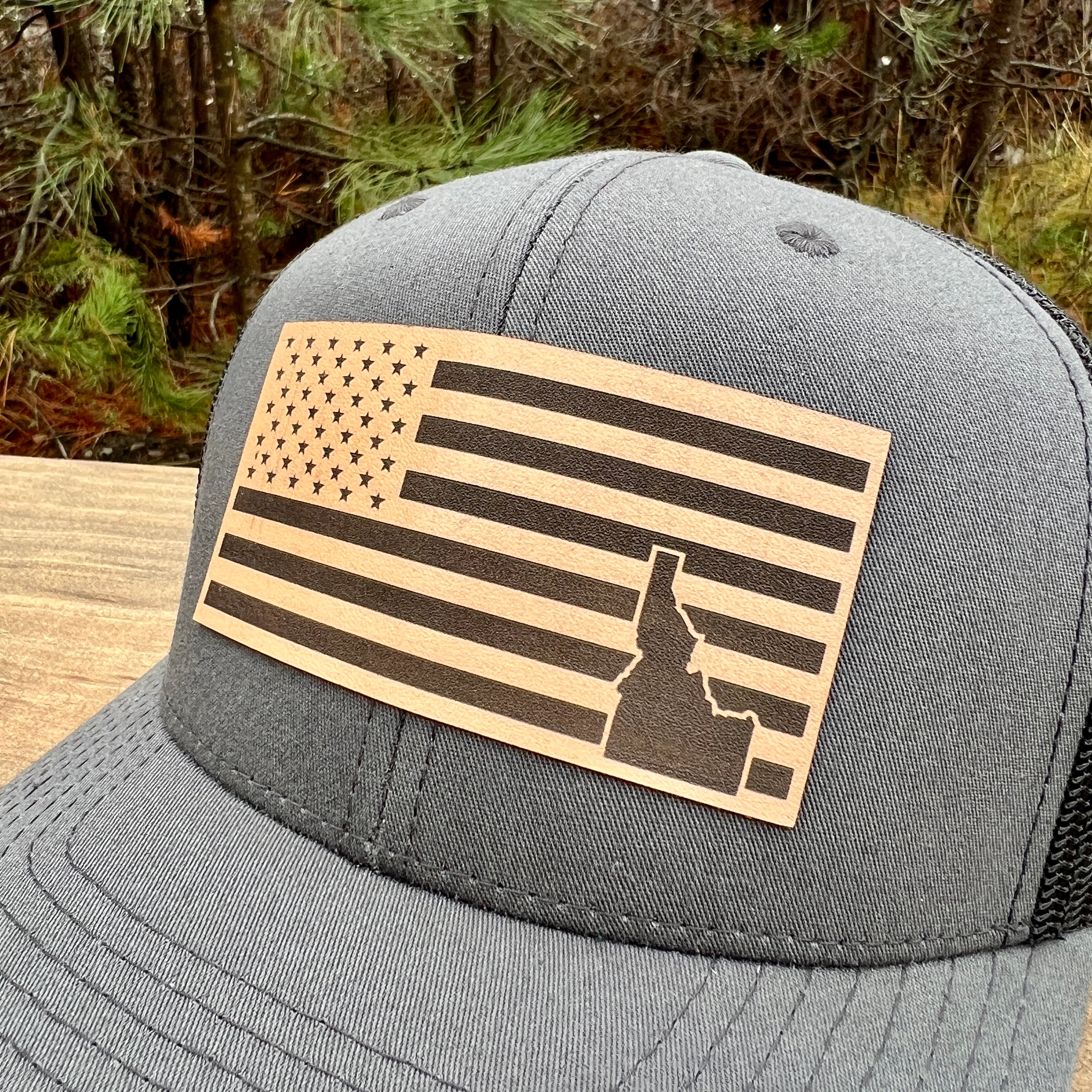Show off your love for Idaho with this snapback trucker hat featuring a beautifully engraved leather patch. The patch showcases the outline of Idaho with an American flag inside, representing your patriotic spirit as an Idahoan. With its trendy design and comfortable fit, this hat is perfect for any occasion. Whether you call Idaho your "Idahome" or you're looking for a unique Idaho gift, this hat is a must-have for all proud Idahoans. Stand out in style and honor your beloved state with this patriotic accessory.