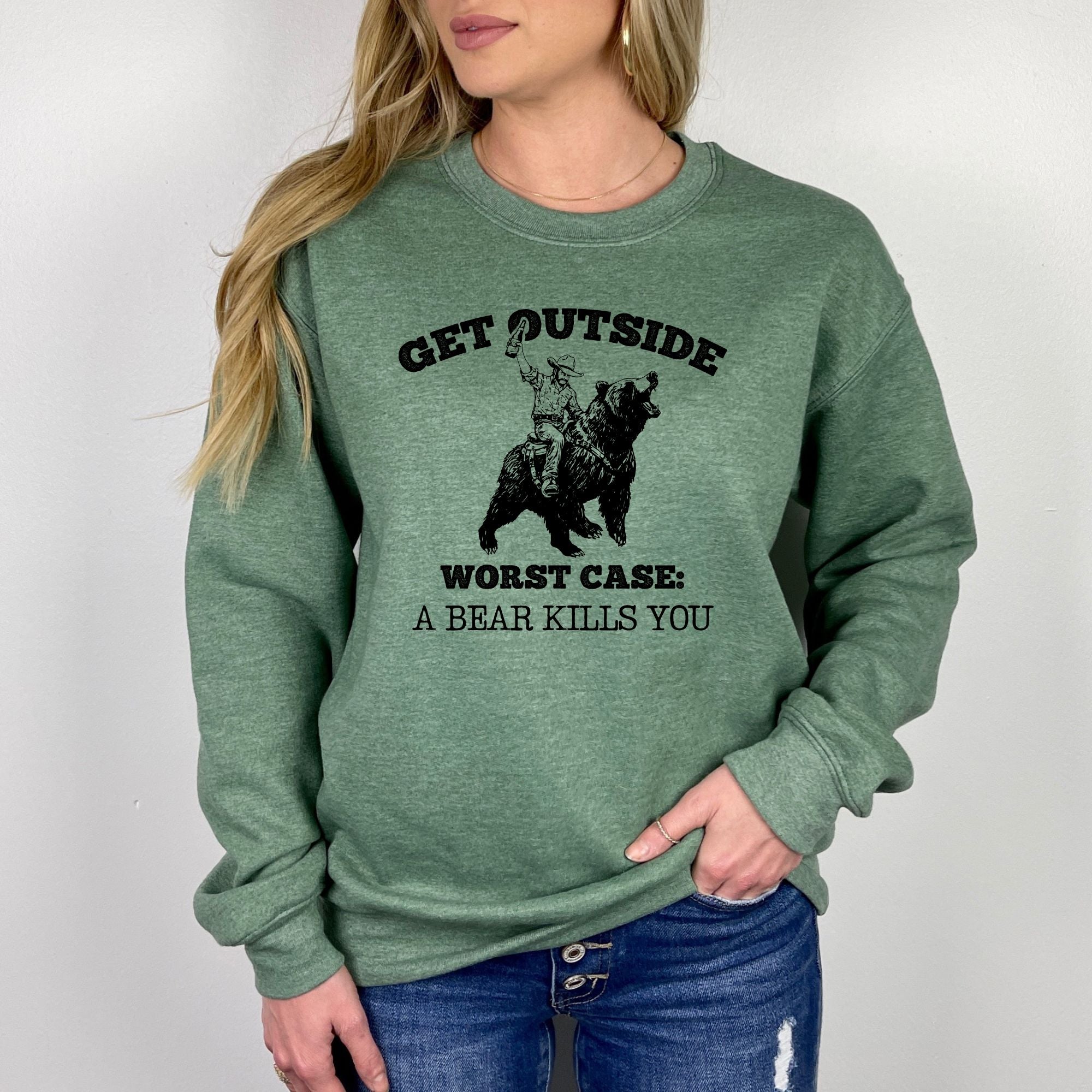 Stay cozy and motivated to get outside with our Hilarious Get Outside Bear Gildan Sweatshirt. The unisex fit and soft material make it perfect for any adventure. Remember, the worst case scenario is a bear killing you, so why not take a chance and enjoy the great outdoors?