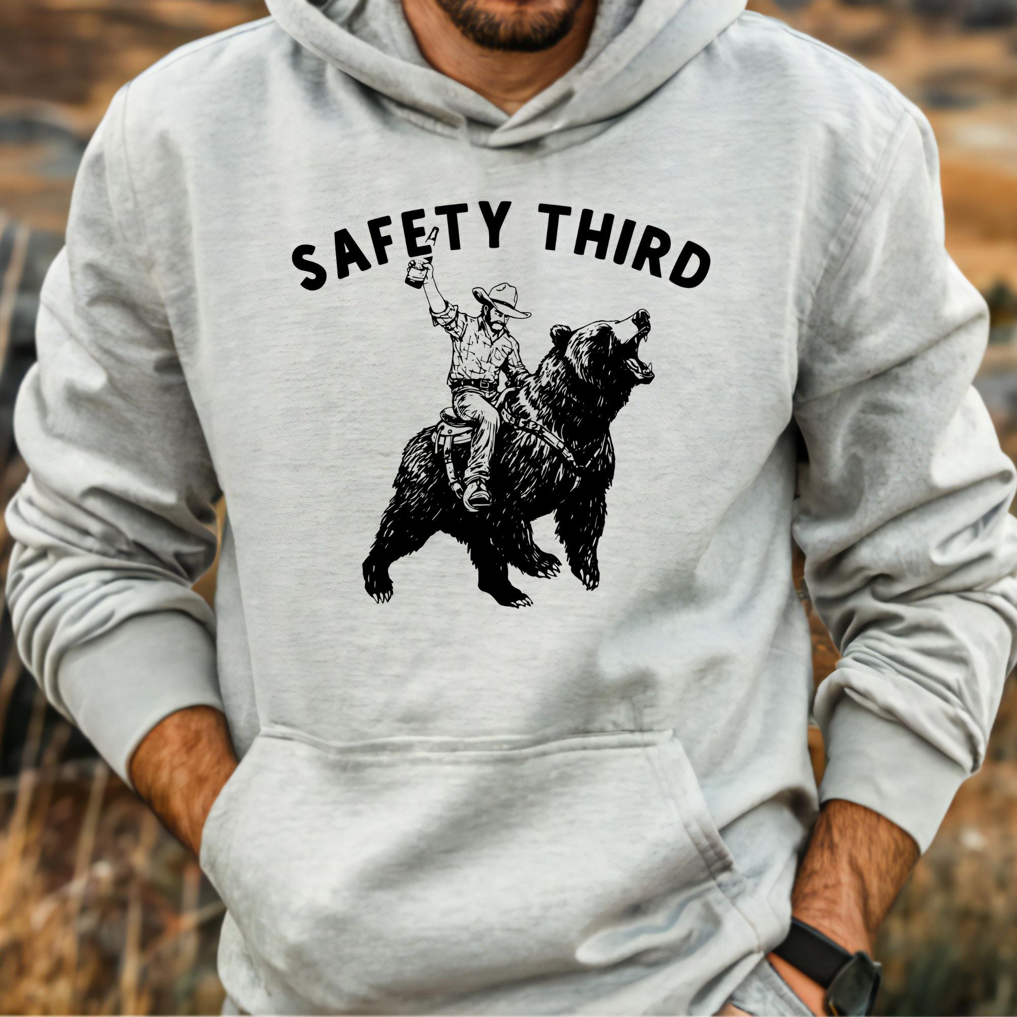 Hilarious shirt for nature lovers featuring a cowboy riding a bear with the words "safety third". This Gildan sweatshirt (available as a crewneck or hoodie) is perfect for those who appreciate a good laugh and the great outdoors. Comfortable and unisex fit.