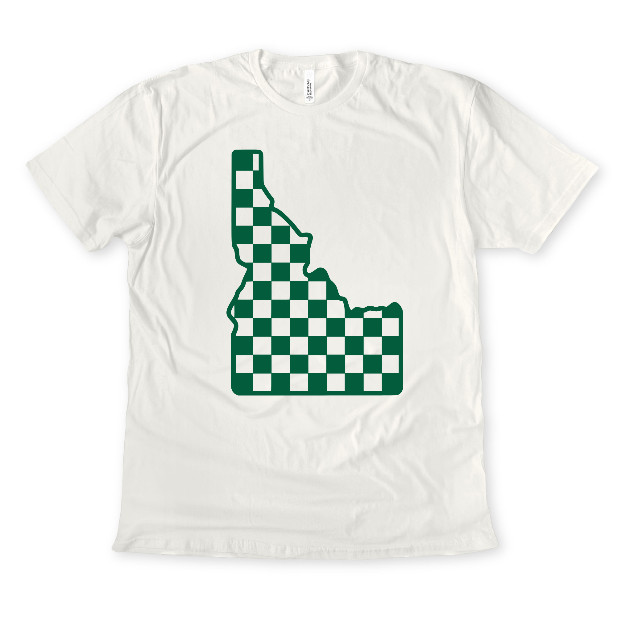 Idaho Checkered Print T-Shirt – Vintage White Tee with Green Ink Logo