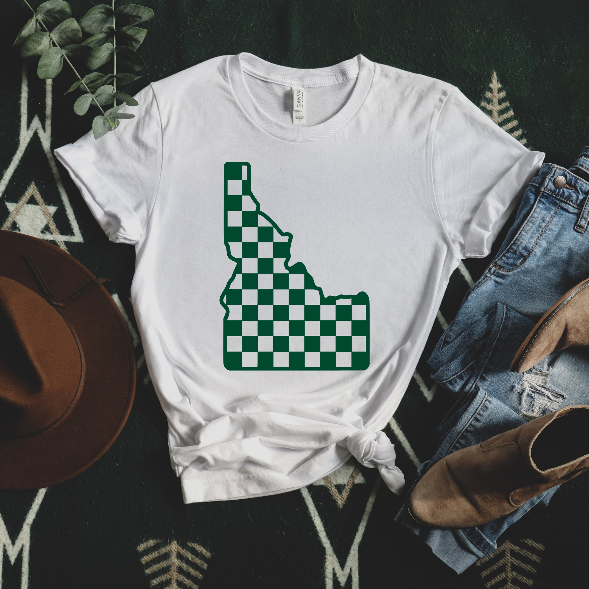 Celebrate your love for the Gem State with this Idaho checkered print t-shirt, featuring a bold green ink logo in the shape of Idaho. The minimalist checkered design keeps it modern yet timeless, making it the perfect piece for locals, travelers, or anyone with Idaho roots.