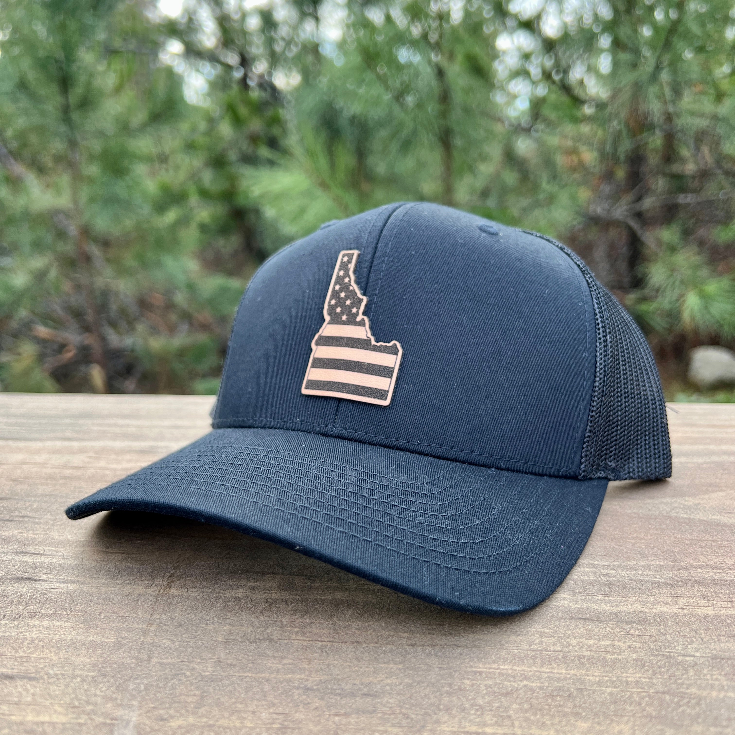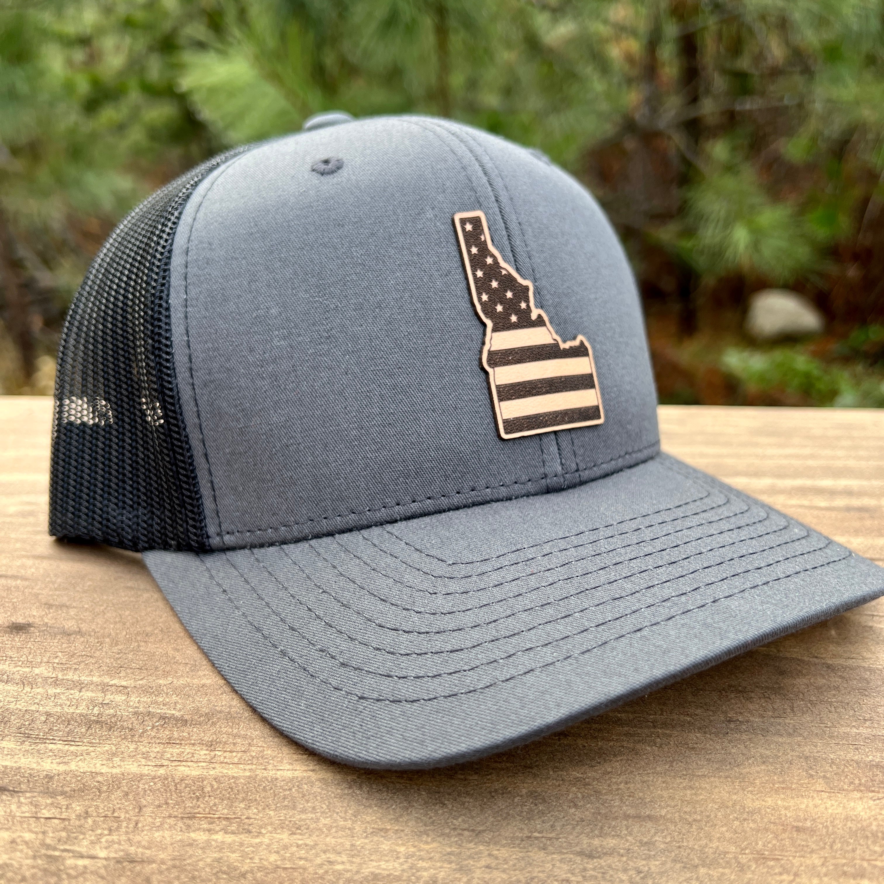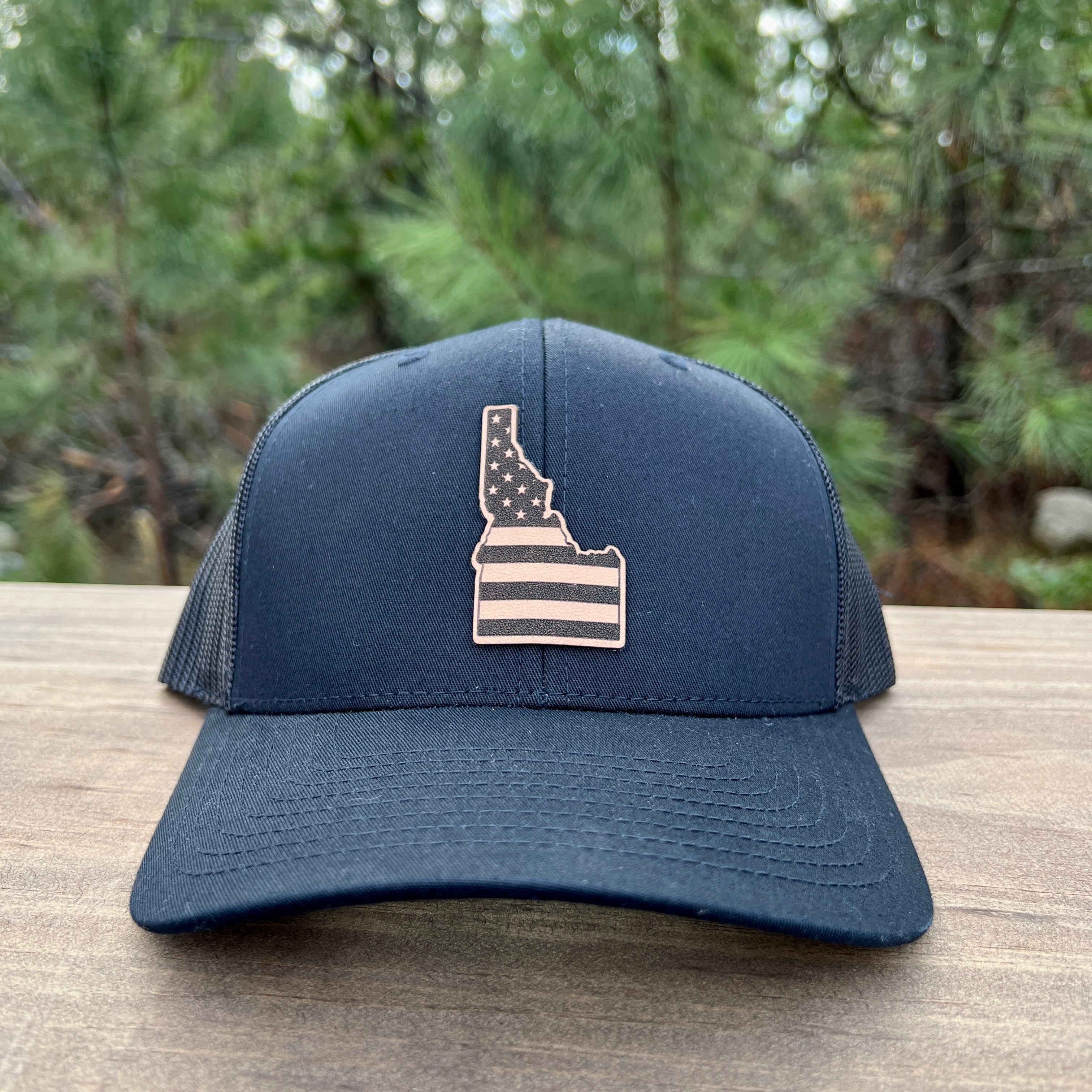 Idaho Flag Hat - Snapback Trucker Style Cap with Engraved Leather Patch