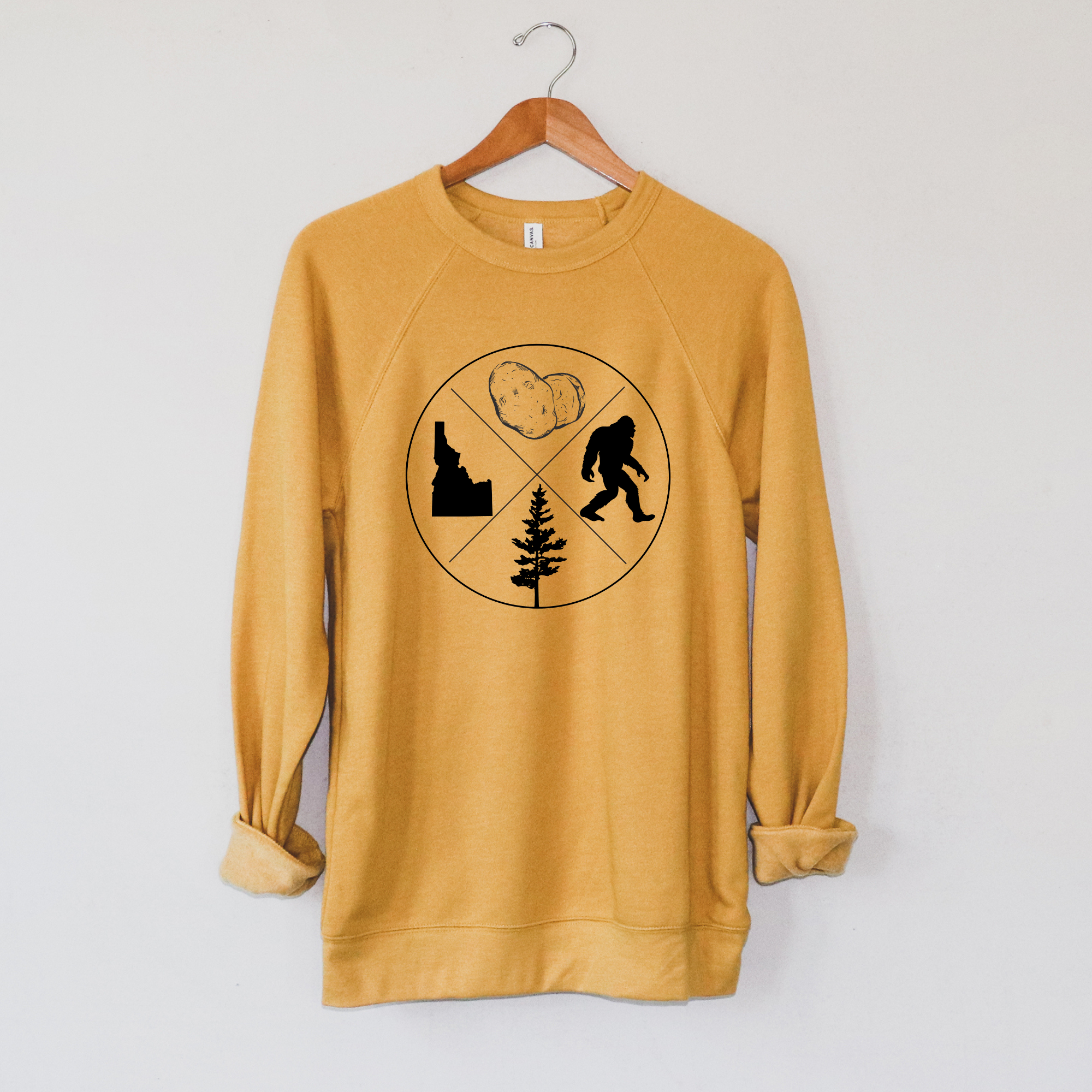 Represent your love for Idaho with our "Idaho's Favorite Things" sweatshirt or hoodie! Featuring iconic elements such as potatoes, western white pine, and the state outline, this unisex fit garment is perfect for showing off your state pride. Don't forget to keep an eye out for Bigfoot, one of Idaho's most famous legends!