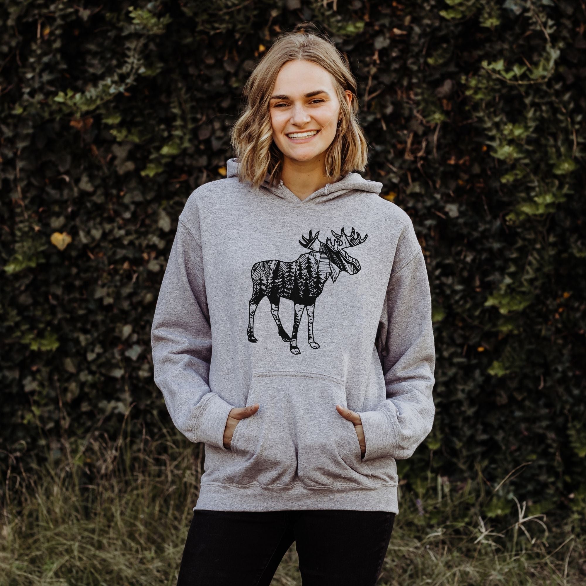 Introducing the perfect cozy companion for nature enthusiasts: our soft and snug sweatshirt featuring an adorable moose design! Crafted with utmost comfort in mind, this sweatshirt is made from a blend of premium fabrics, ensuring a soft and gentle feel against your skin. The standout feature is the captivating nature scene nestled within the moose, transporting you to the heart of the wilderness. As you wrap yourself in this cozy attire, the moose's intricate design showcases the beauty nature. Perfect for lounging at home or embarking on outdoor adventures, this sweatshirt effortlessly combines style, comfort, and the awe-inspiring beauty of wildlife.