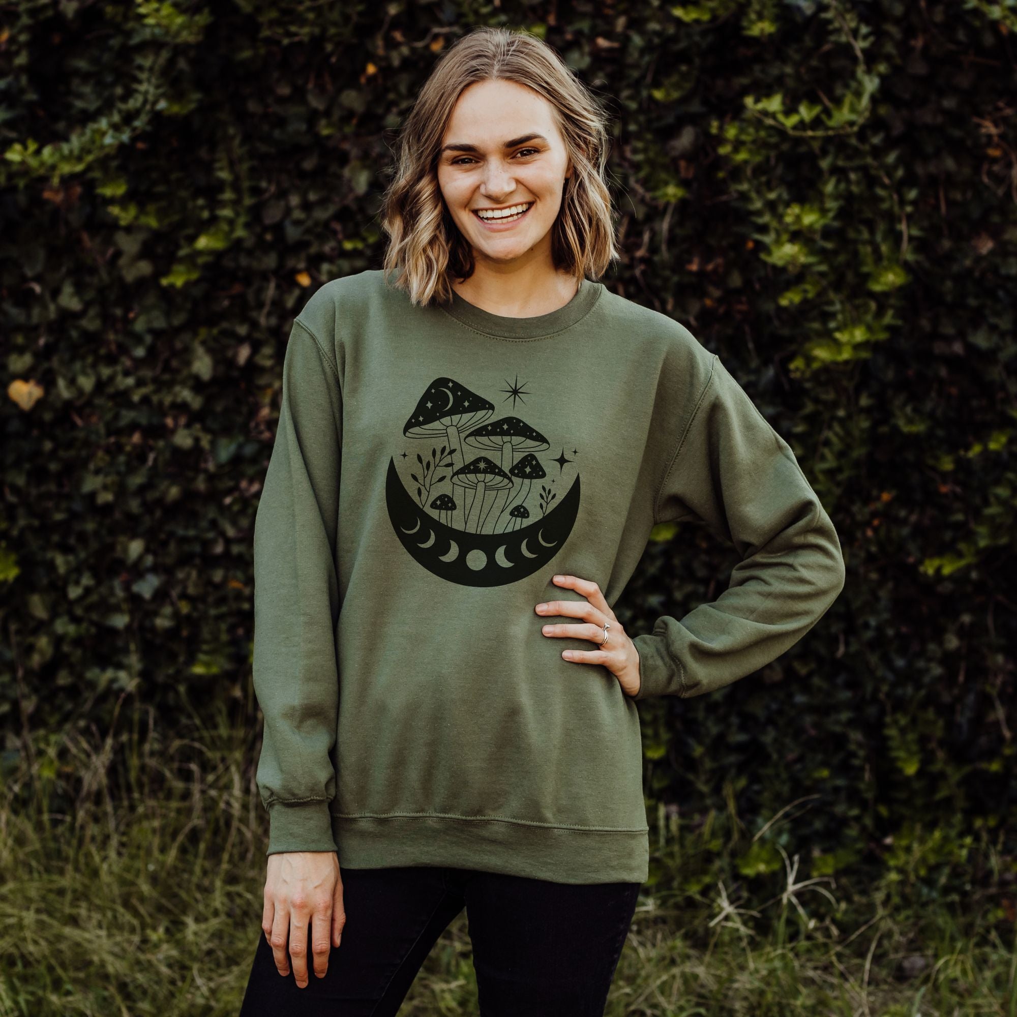 This Mystical Mushroom Sweatshirt is perfect for nature lovers. Crafted from a cozy material, the sweatshirt features an intricate design of a mystical mushroom that adds a unique style to any outfit.