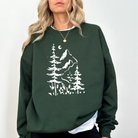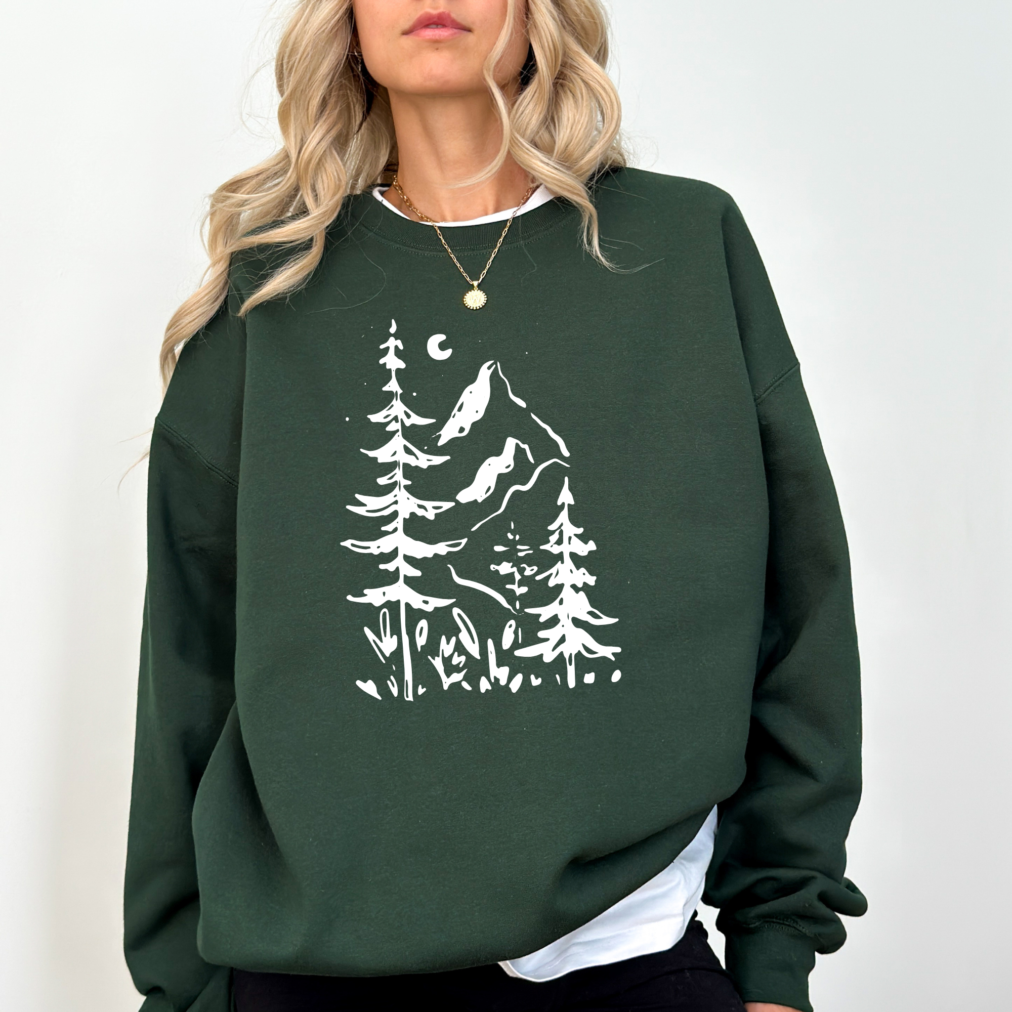 This unisex fit sweatshirt features a tranquil nature scene with mountains, trees, and a moonlit sky design. Perfect for those who love the great outdoors, this sweatshirt offers both comfort and style. Made with high-quality materials and precision stitching, it is sure to become a favorite addition to any wardrobe.