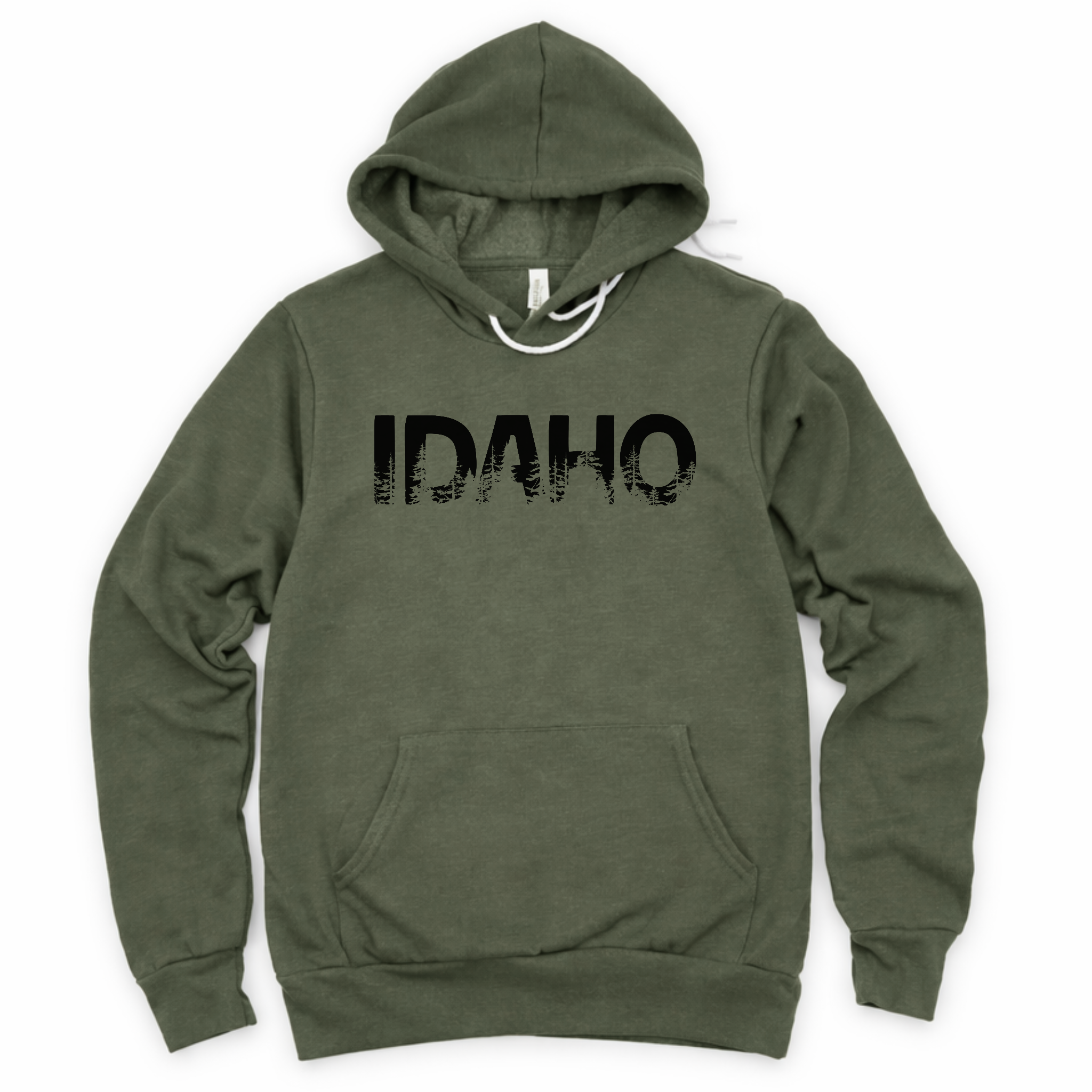 Idaho Sweahoodie featuring the word “Idaho” with a pine tree silhouette. Hand screenprinted in Idaho on a premium unisex shirt, perfect for nature lovers and state pride.