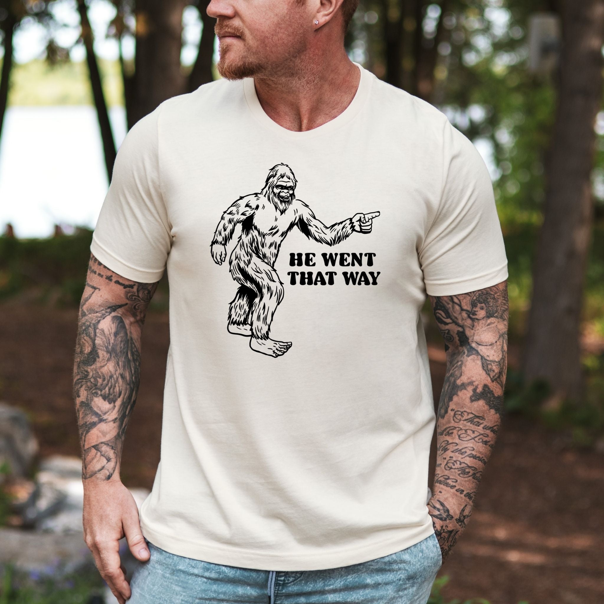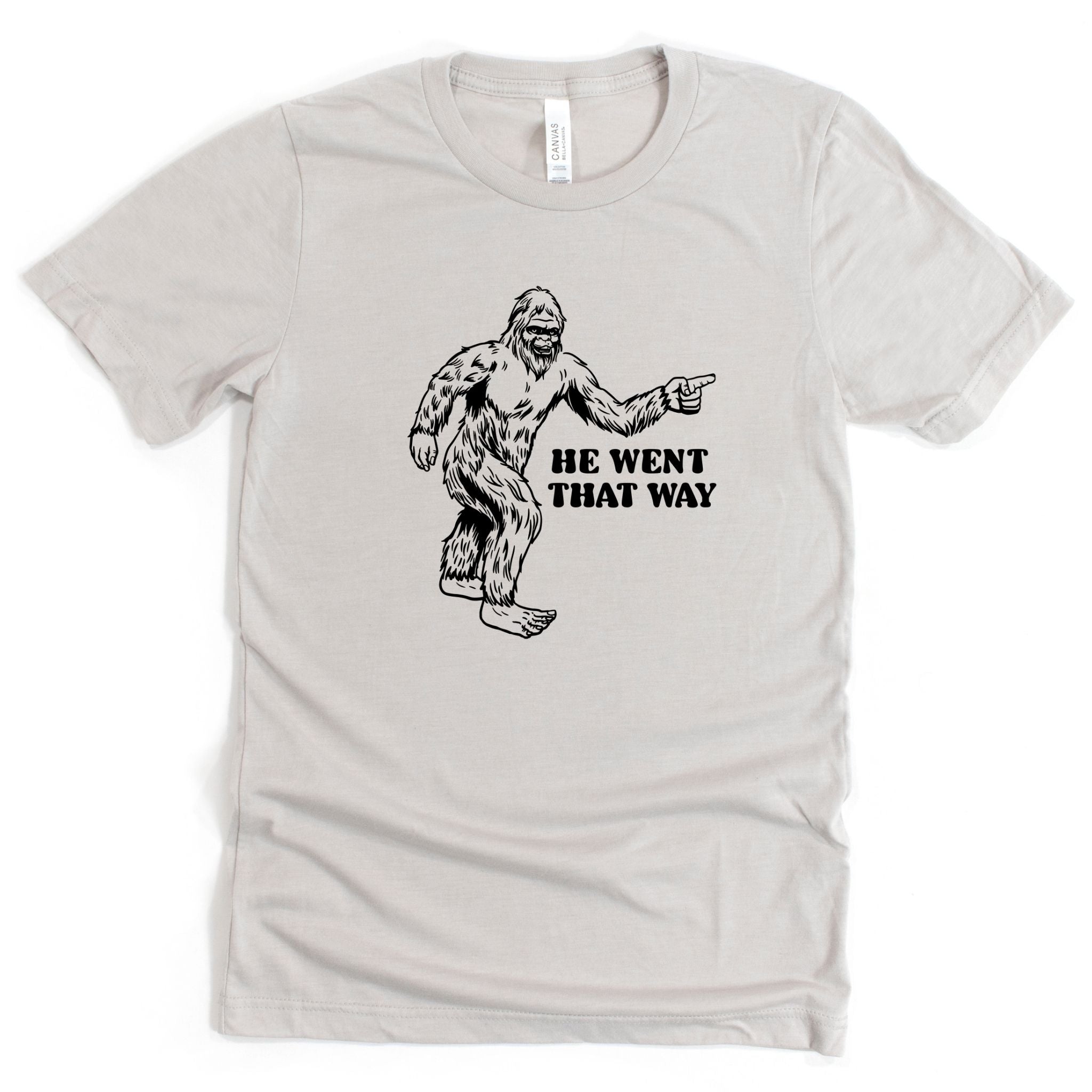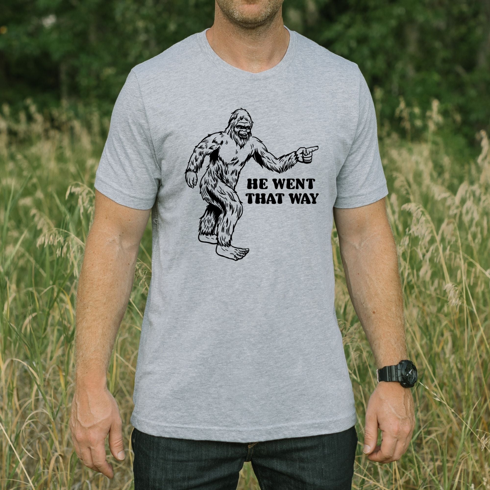 bigfoot tshirt, sasquatch tee, funny bigfoot, forest humor tee, he went that way, outdoor graphic tee, hiking humor tee, cryptid shirt, unisex bigfoot, wilderness tee, funny nature tee, bigfoot gift, camping shirt