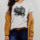 Get ready for adventure with this whimsical t-shirt featuring everyone's favorite creature - Bigfoot! With a playful wave, Bigfoot invites you to join him by the campfire, surrounded by the serenity of the woods. A friendly squirrel keeps him company while a majestic mountain range completes the picturesque background. Crafted from soft and breathable fabric, this tee ensures optimal comfort, while the vibrant colors and detailed artwork make it a standout addition to your wardrobe. Embrace the spirit of the outdoors and express your love for Bigfoot with style!
