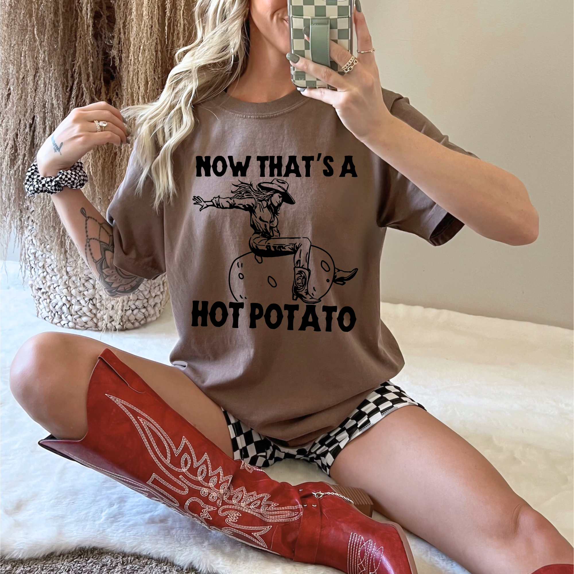 This playful graphic tee features a fearless cowgirl riding a giant Idaho potato like a bucking bull, holding on for dear life as it kicks up dust! With the phrase "Now that's a hot potato!" boldly displayed, this design is a perfect mix of western grit and spud-loving humor. Whether you're a rodeo fan, a potato enthusiast, or just love a good laugh, this tee is sure to be a conversation starter!