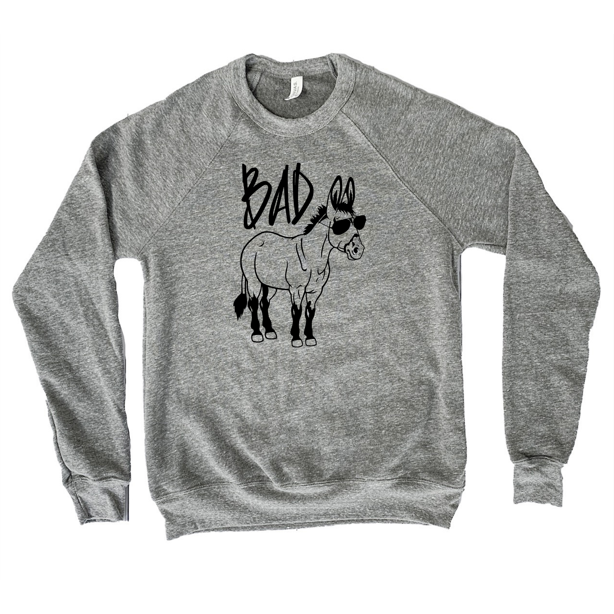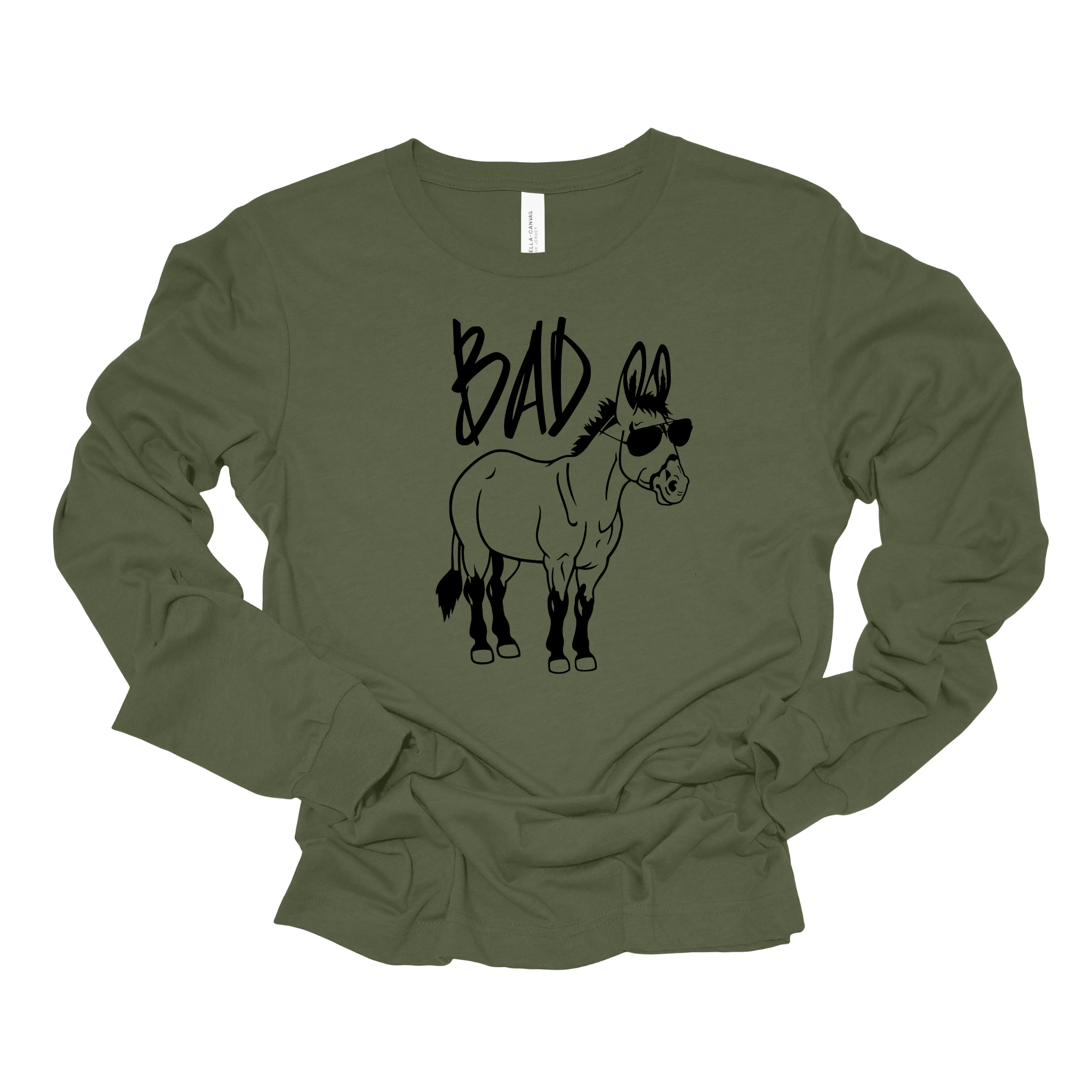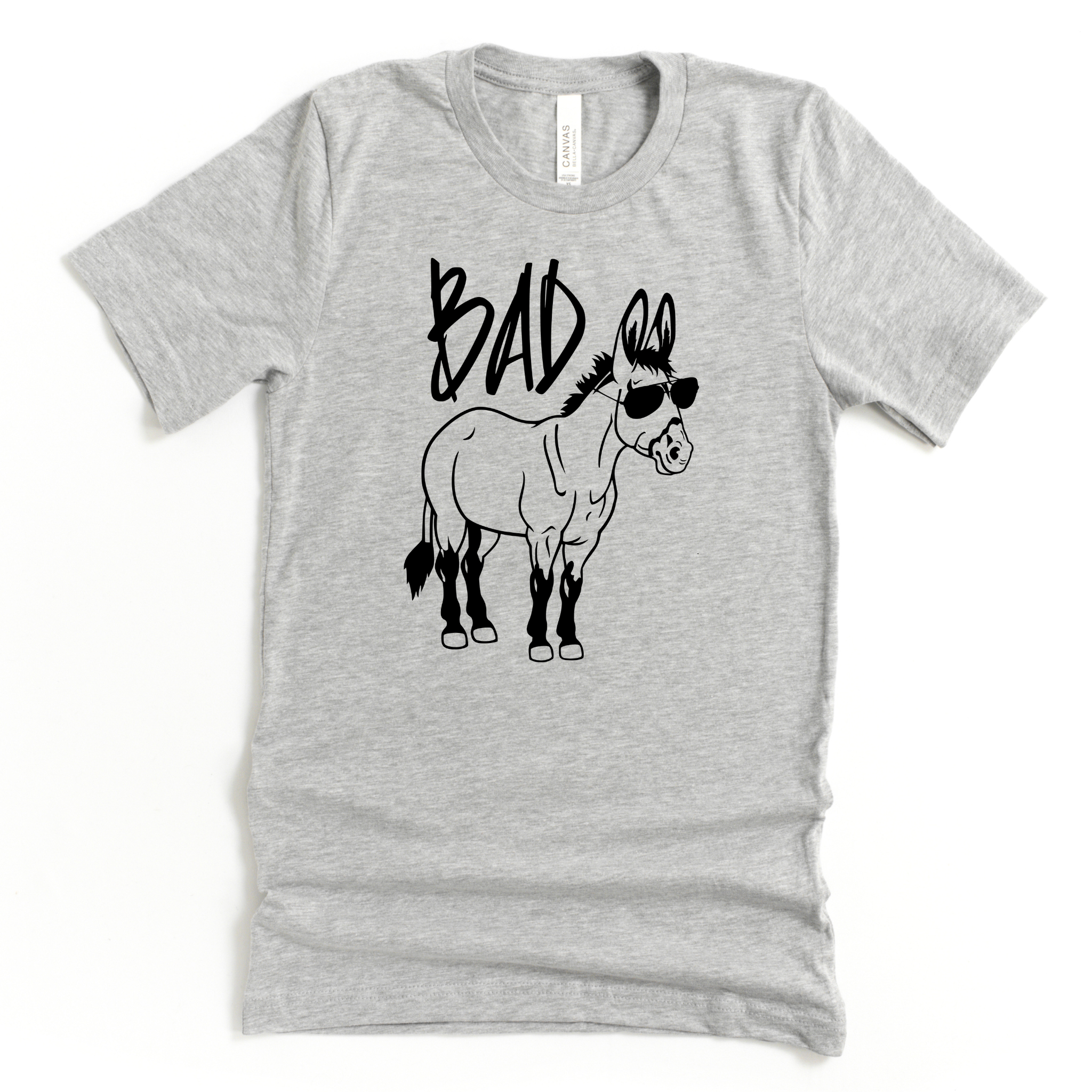 The funny badass donkey tshirt is a unisex t shirt designed to deliver comfort and style with a cool donkey design that stands out in casual streetwear. Made from a soft cotton blend, this Bella Canvas tee features a badass animal shirt graphic showing a donkey wearing sunglasses, hand screen printed for lasting quality. Perfect as a men's novelty tee or women's graphic top, this donkey sunglasses tee combines humor and edge for everyday wear.