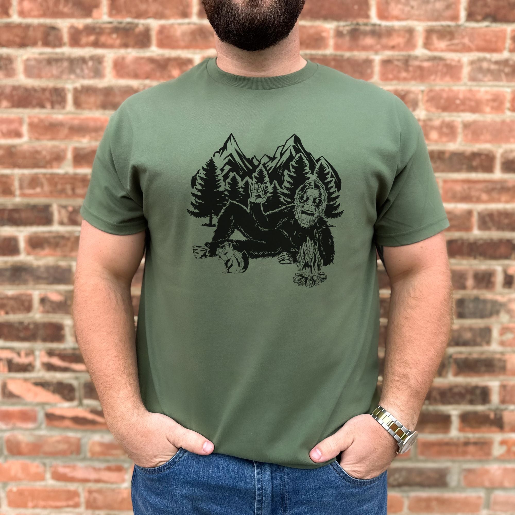 bigfoot tee, sasquatch shirt, forest graphic, relaxed bigfoot, funny bigfoot, nature humor, outdoor lifestyle, hiking vibes, camping tee, unisex graphic, idaho made tee, screenprinted shirt, cryptid tee