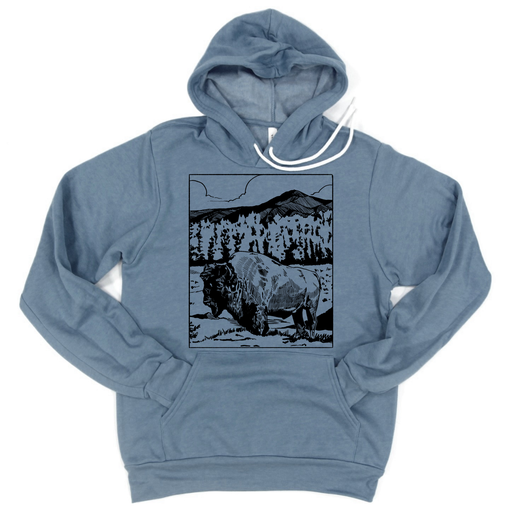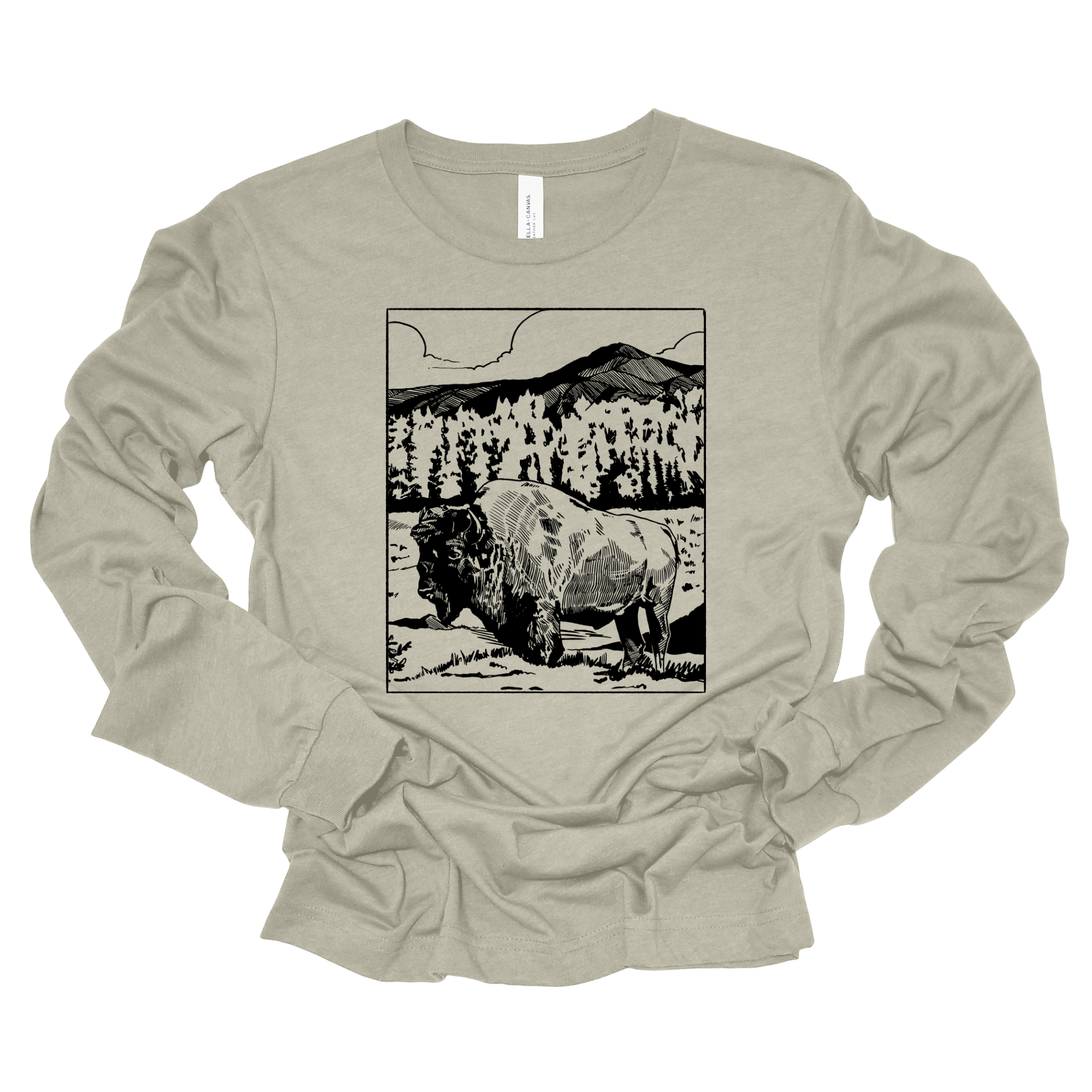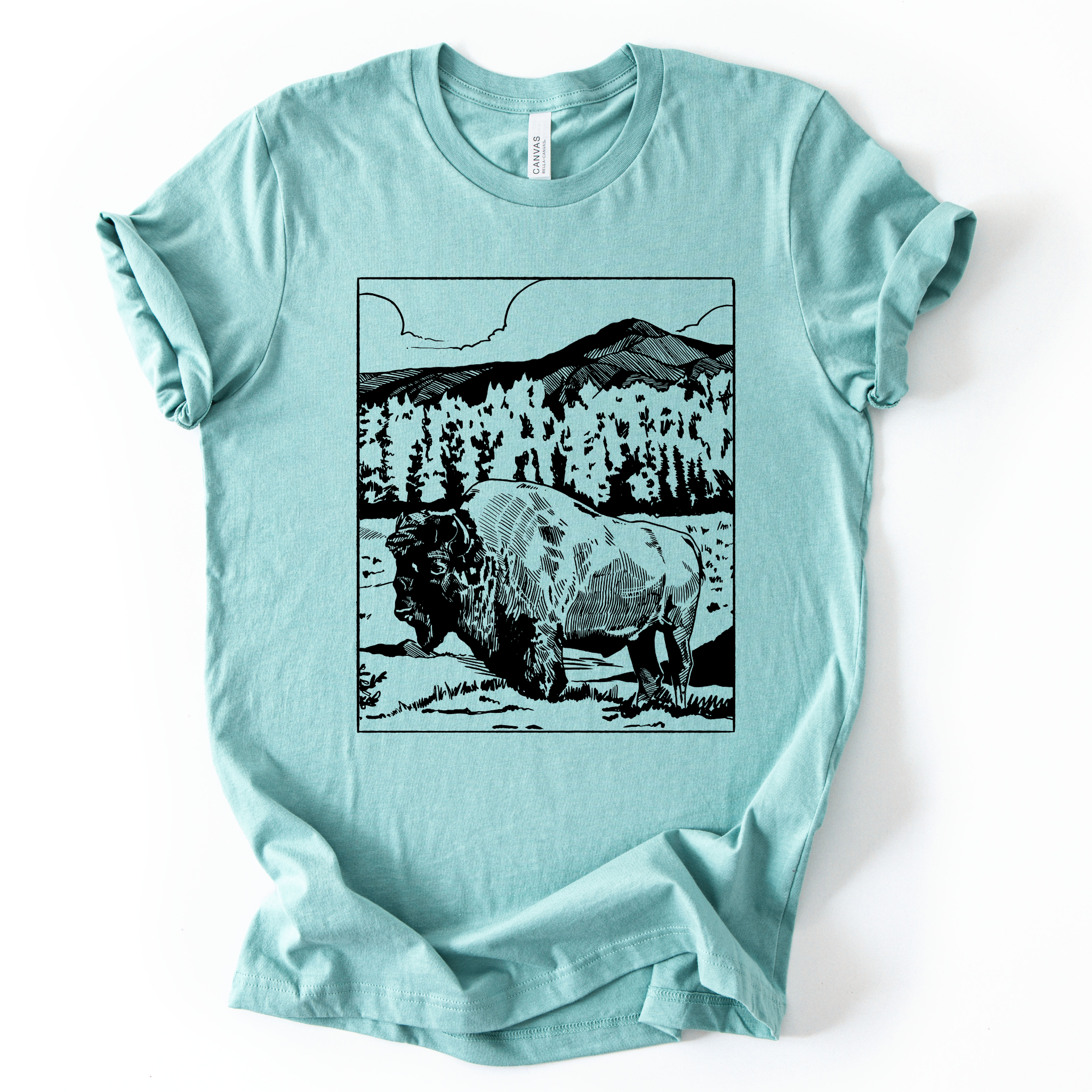 The bison roaming t-shirt offers adventurers a unique blend of comfort and style with its striking hand drawn buffalo graphic. Crafted from a soft cotton blend, this unisex fit shirt captures the spirit of the wild with a detailed buffalo print top set against a majestic mountain range. Designed for nature lovers, this comfortable outdoor shirt delivers both durability and breathability for all-day wear.