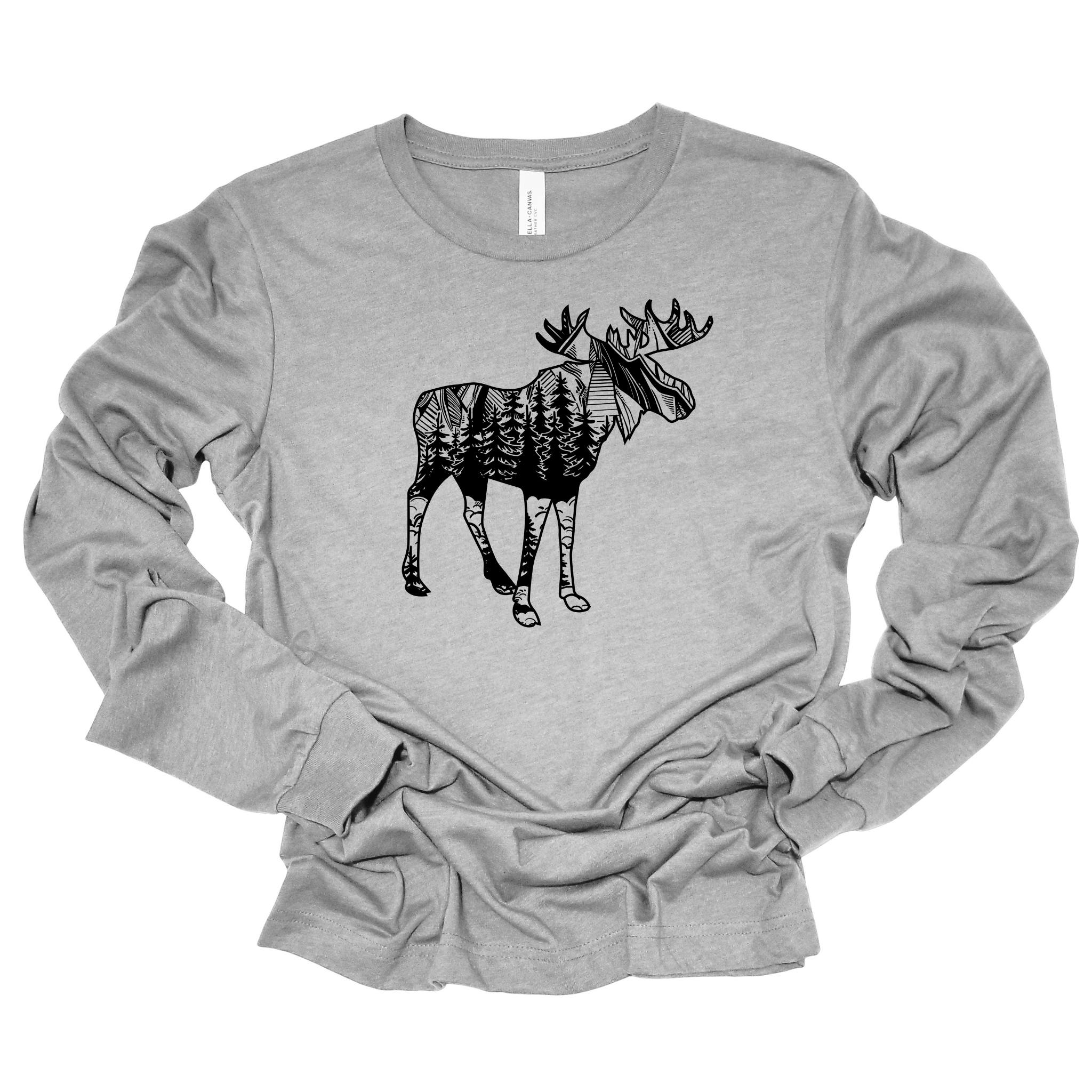 Moose shirts women will love combine style and comfort in this wildlife graphic tee designed for outdoor casual wear and everyday adventures. Crafted from a soft cotton blend, this unisex fit shirt features a striking moose outline filled with a mountain graphic tee scene that captures the spirit of nature inspired tees. Whether you're wearing it as cozy casual style for camping or lounging, this hand screen printed Bella Canvas shirt brings animal print apparel to a new level of comfort and durability.