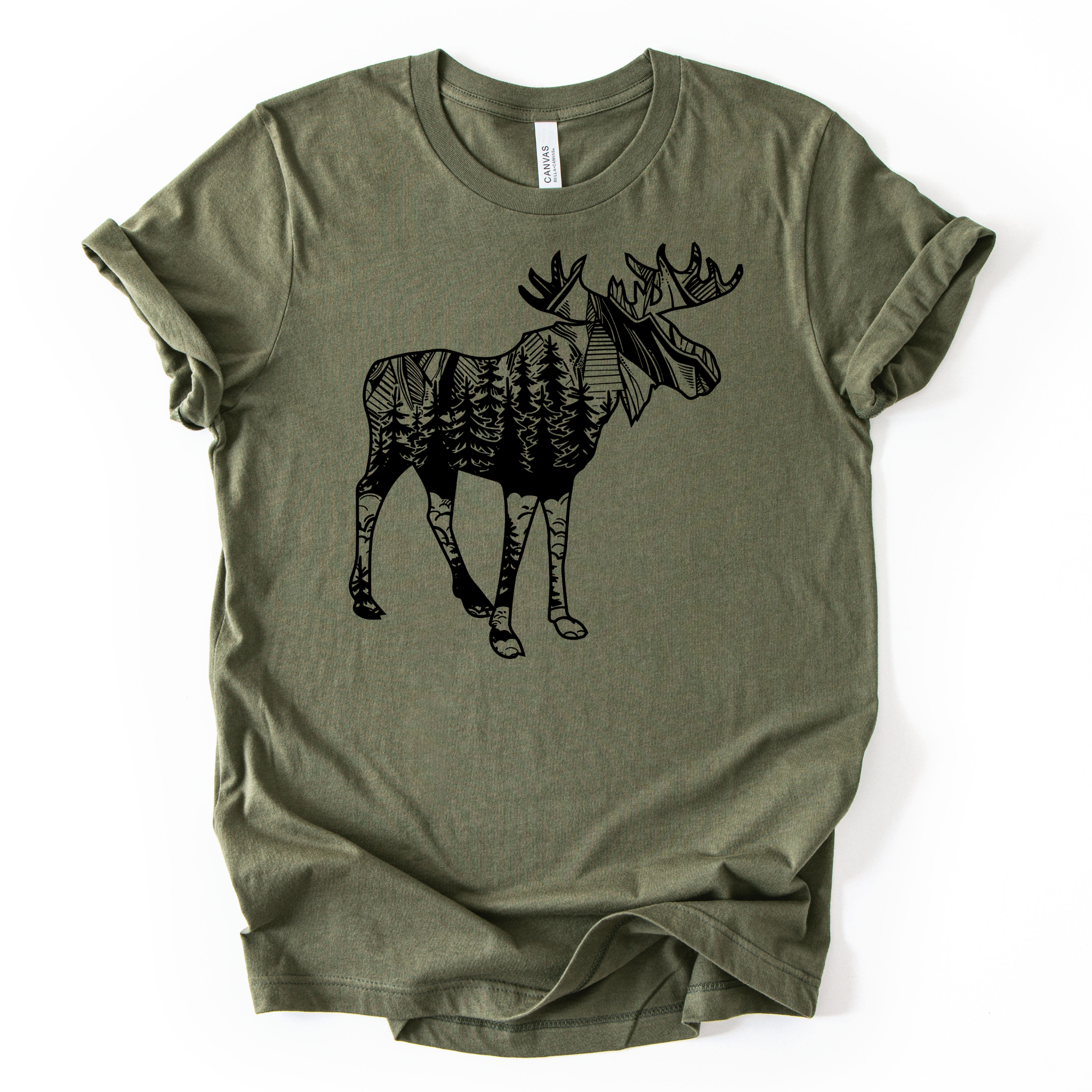 This women's short sleeve tee is made from a premium poly/cotton blend fabric that offers breathability and softness for all-day wear. The unisex fit shirt is available in sizes S to 2XL, fitting women comfortably with size ranges from 2-20 depending on your choice. Each design is meticulously hand screen printed in black ink on Bella Canvas shirts, ensuring vibrant and lasting graphics that stand up to frequent washing. The detailed moose with nature scene highlights your love for the outdoors while providing a versatile look perfect for hiking, camping t-shirts, or casual urban wear.
