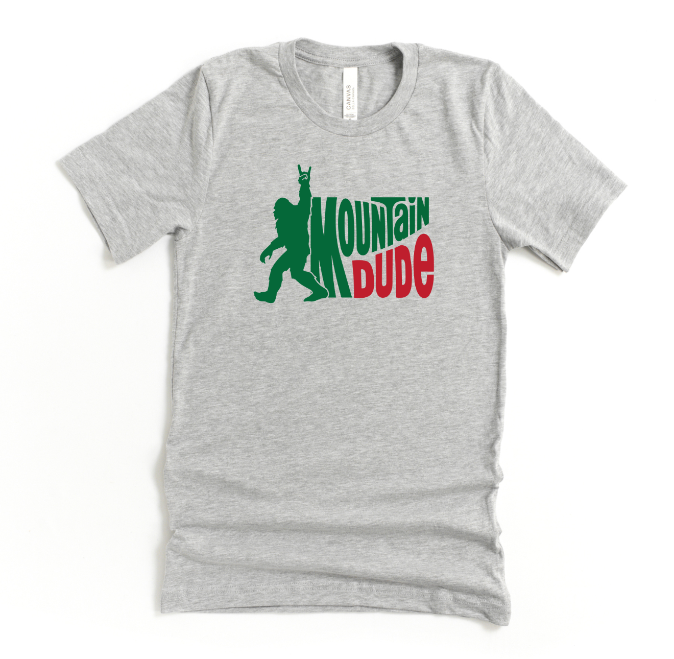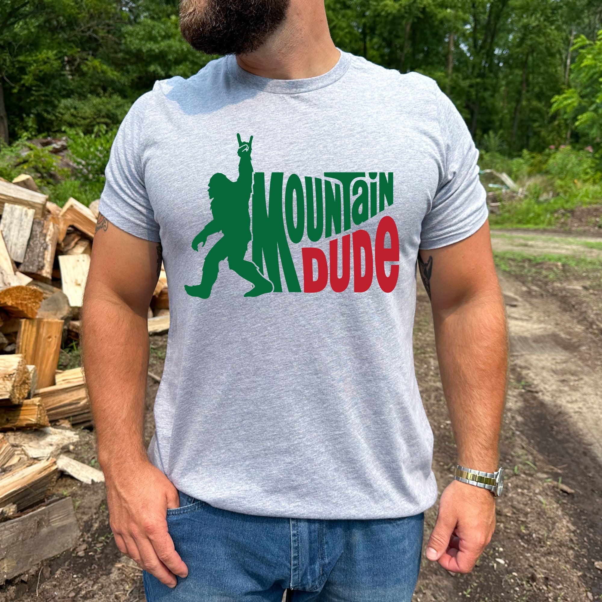 mountain dude tee, bigfoot shirt, sasquatch tee, red green ink, outdoor humor, mountain graphic, forest vibes tee, funny bigfoot, unisex graphic tee, idaho made shirt, screenprinted tee, nature humor, adventure tee