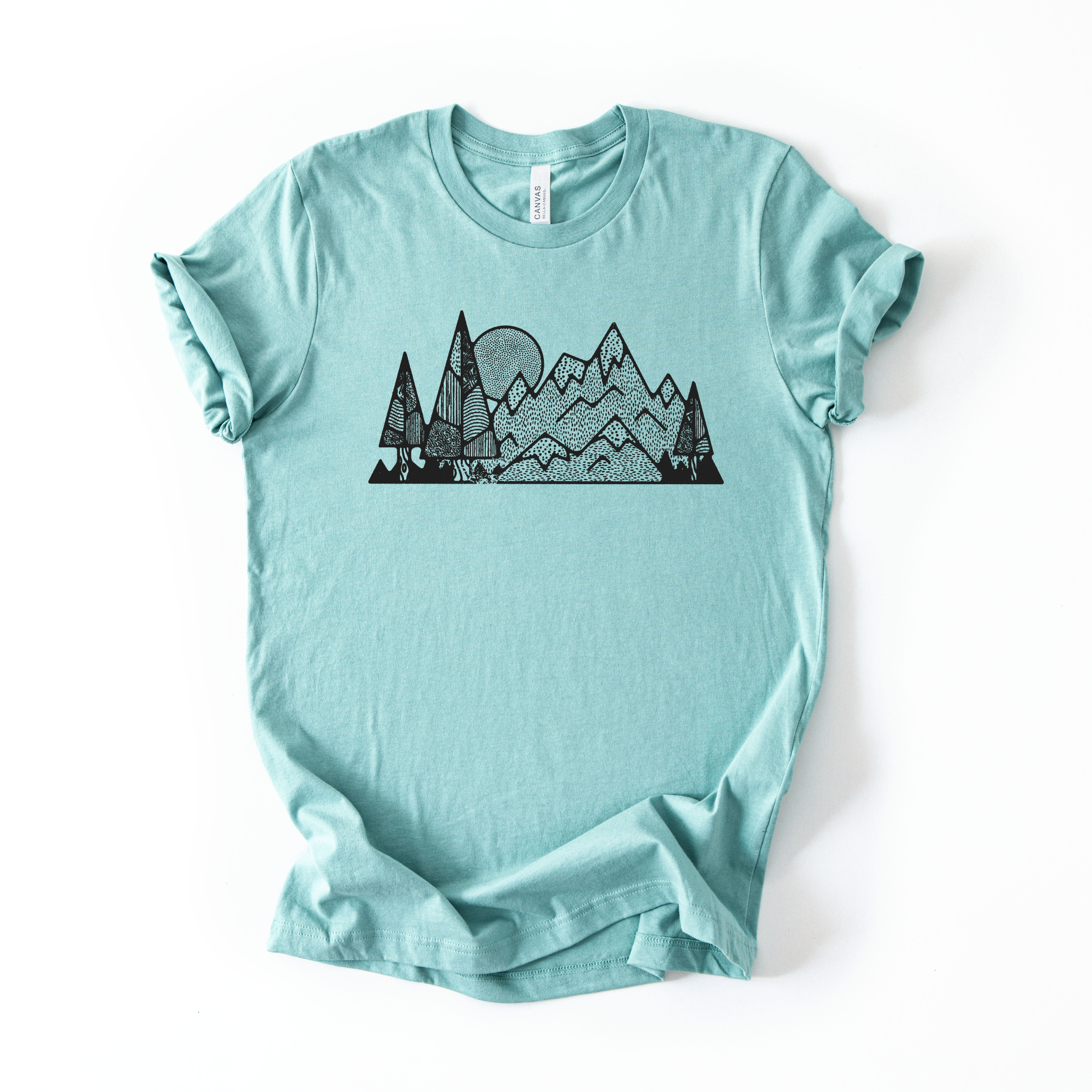 geometric tee, mountain graphic, tree graphic tee, minimalist shirt, nature design tee, outdoor graphic, modern nature tee, hiking lifestyle, forest graphic, unisex graphic tee, idaho made tee, premium cotton tee, simple nature