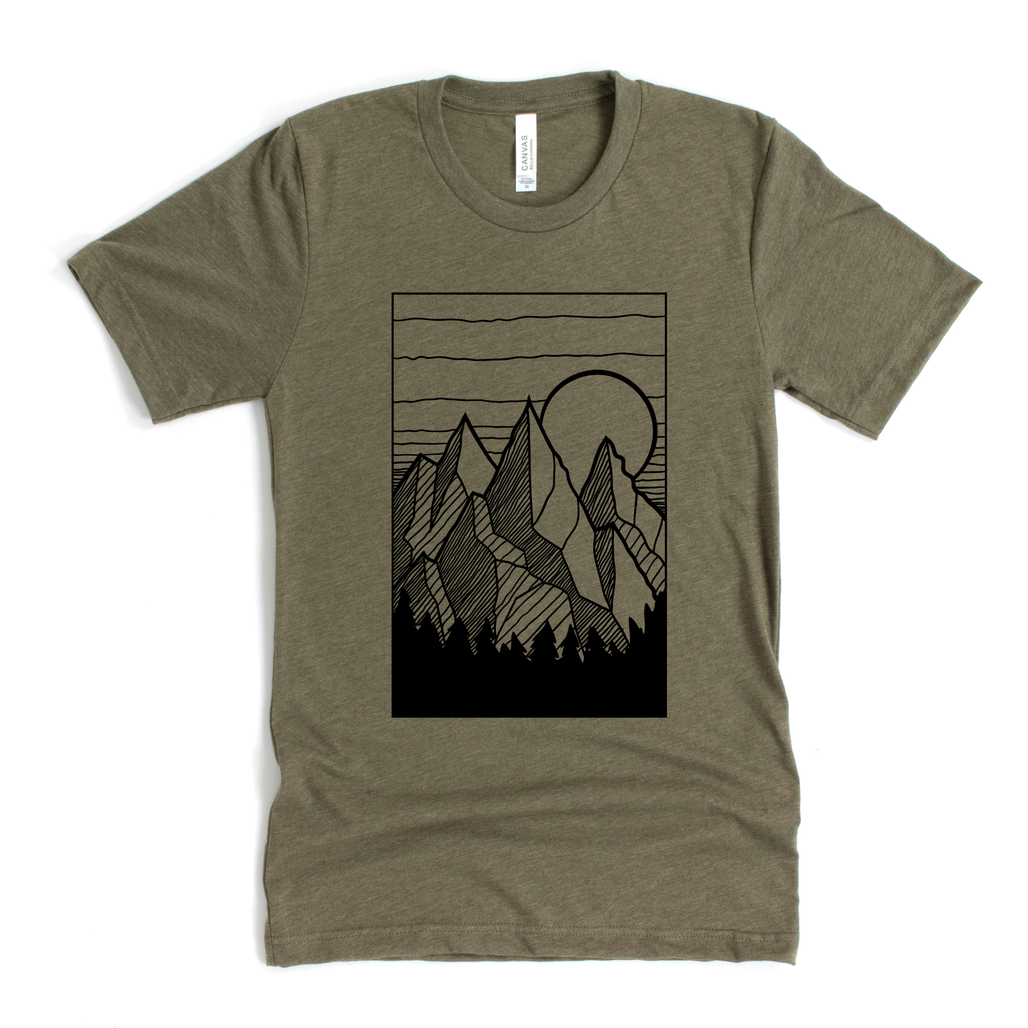 The Mountain Nature TShirt is a unisex graphic tee designed for outdoor casual wear and everyday comfort. Made from a soft cotton blend, this Bella Canvas shirt features a striking tree illustration and forest design tee that captures the essence of nature. Whether you need a men's hiking shirt or a casual graphic top for relaxing days, this nature graphic tee delivers durability and style. Hand screen printed with care, it ensures lasting quality and vibrant detail.