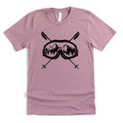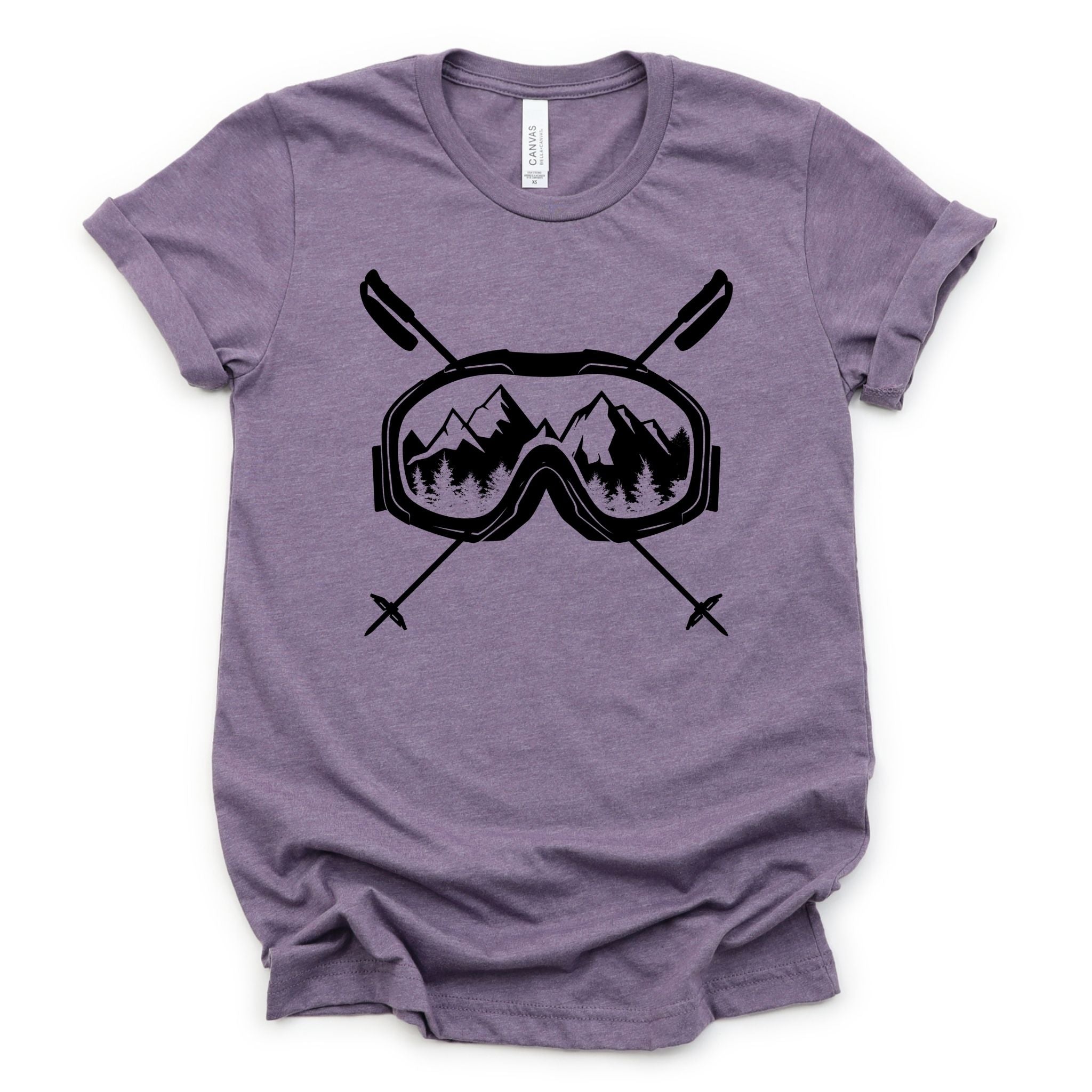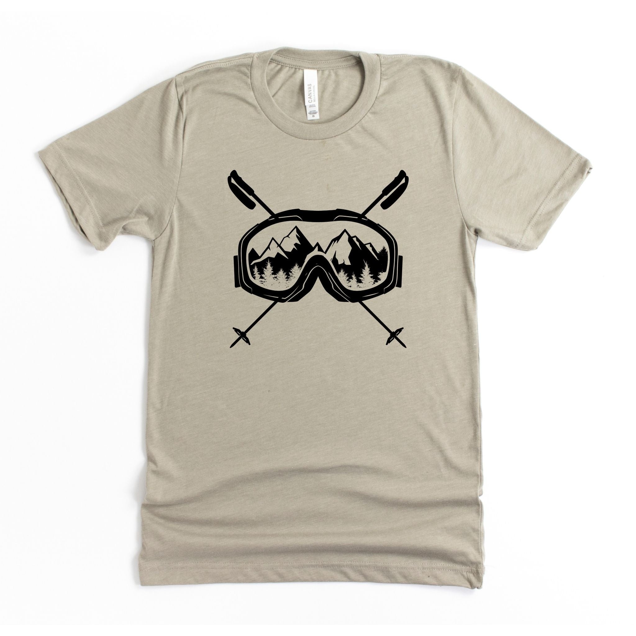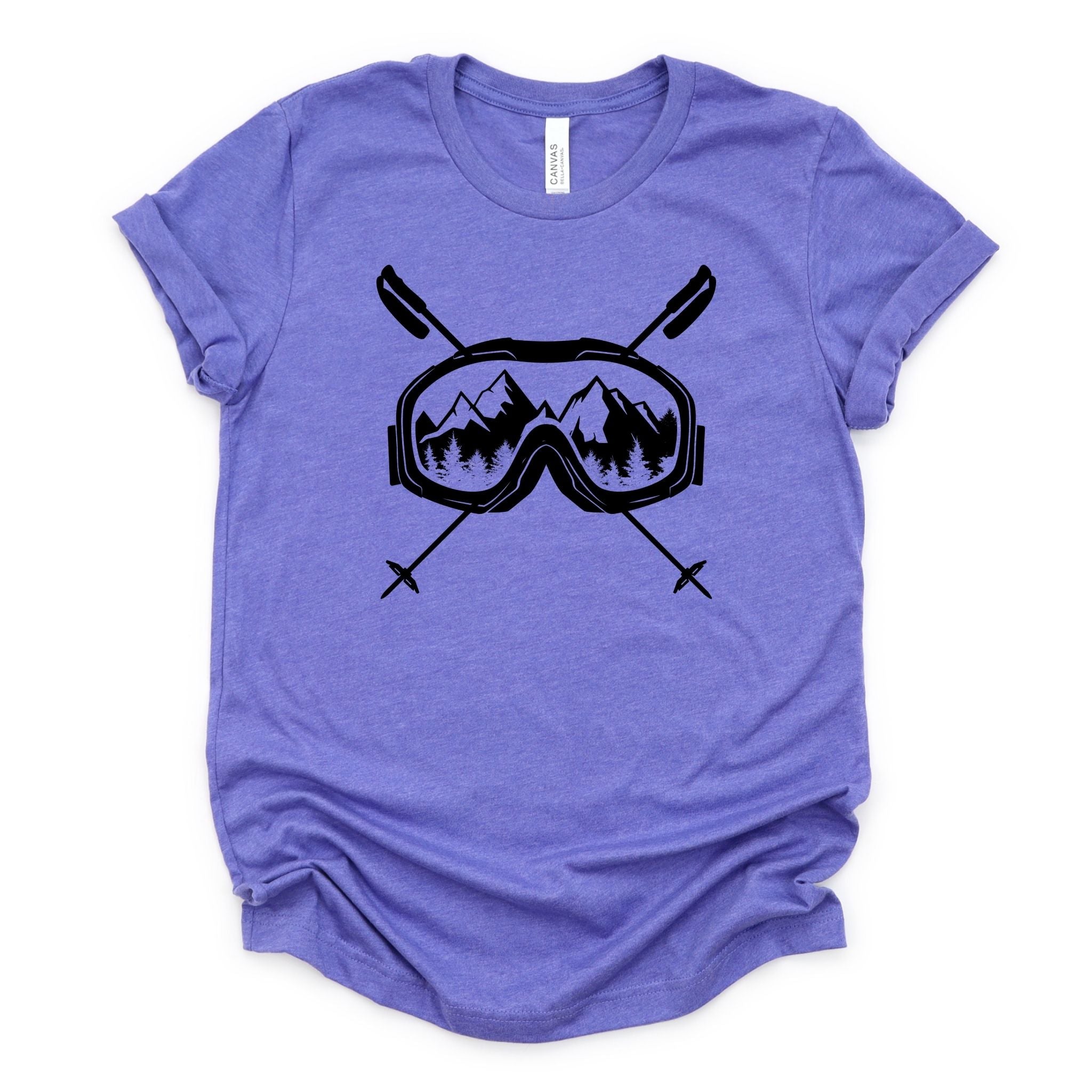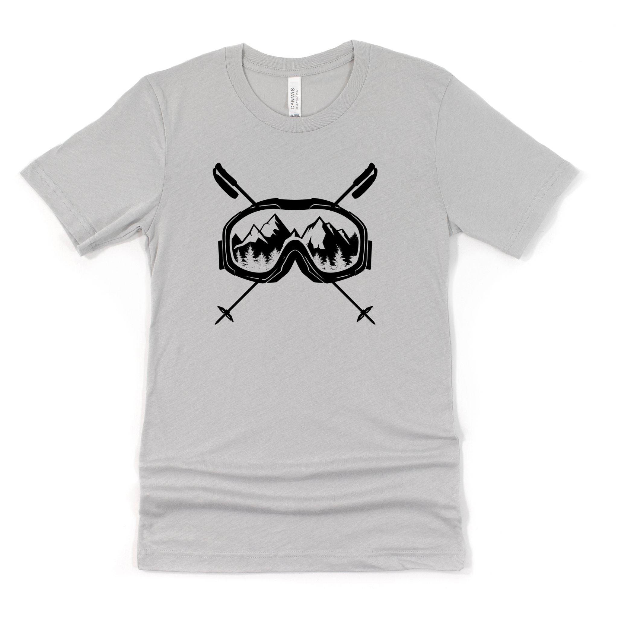 This skiing tshirt is a must-have for any ski enthusiast looking for comfort and style on and off the slopes. The unisex ski tee features a striking graphic ski shirt design with ski goggles and crossed poles set against a mountain backdrop, printed on a soft cotton blend fabric that delivers lasting comfort throughout your winter sports wear. Crafted from a premium poly cotton blend, this Bella Canvas shirt combines durability with breathability to keep you comfortable during casual ski style or après-ski activities. Available in sizes S through 2XL and 11 vibrant colors, it fits a wide range of body types and preferences.