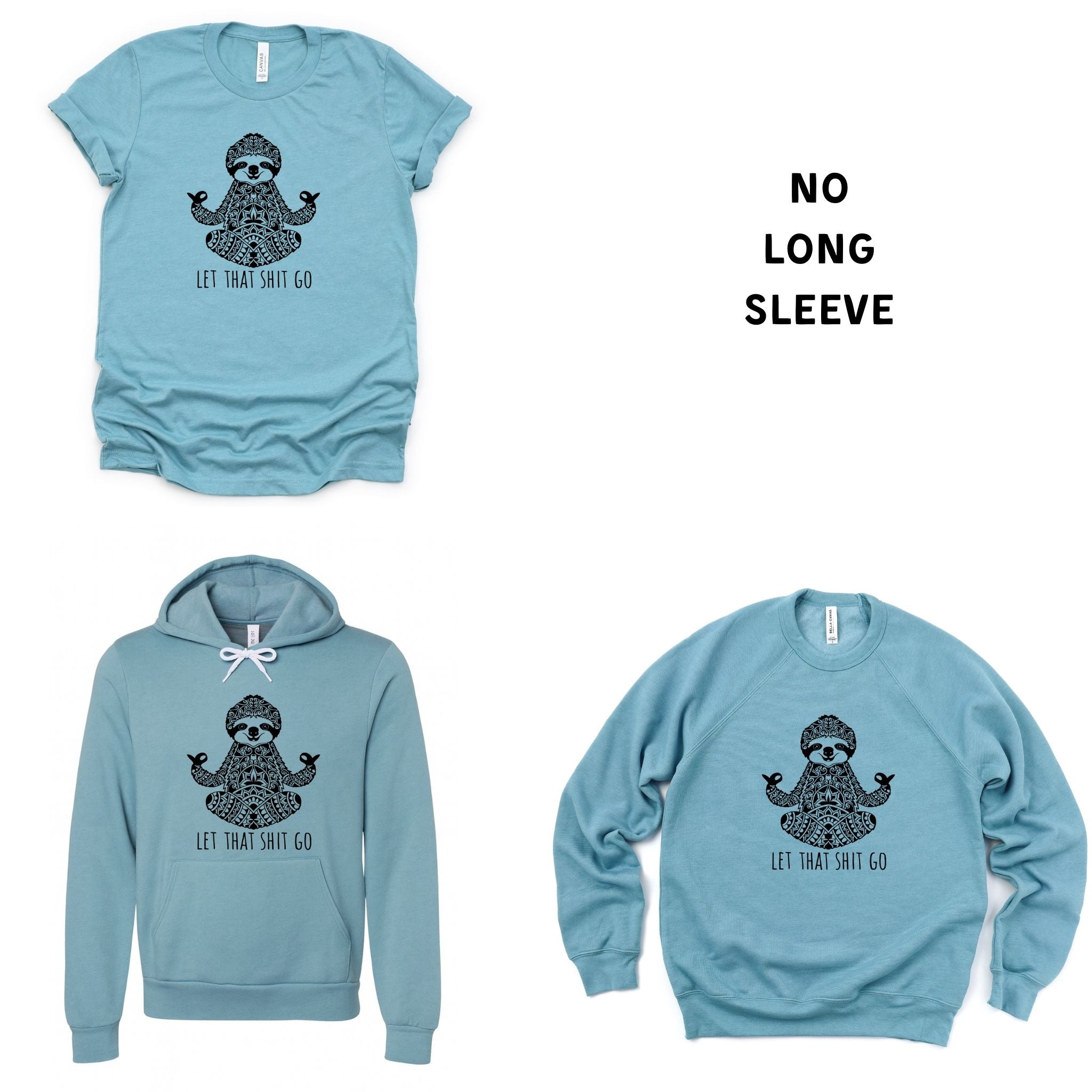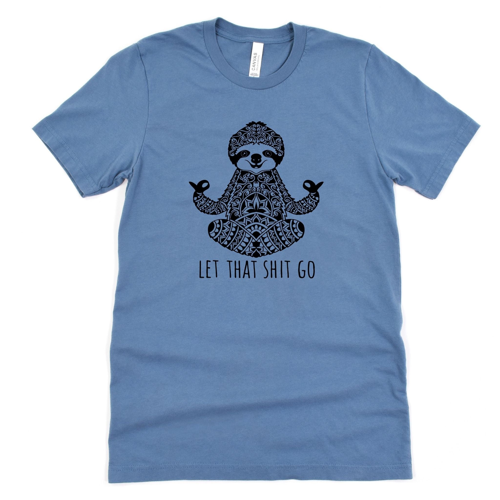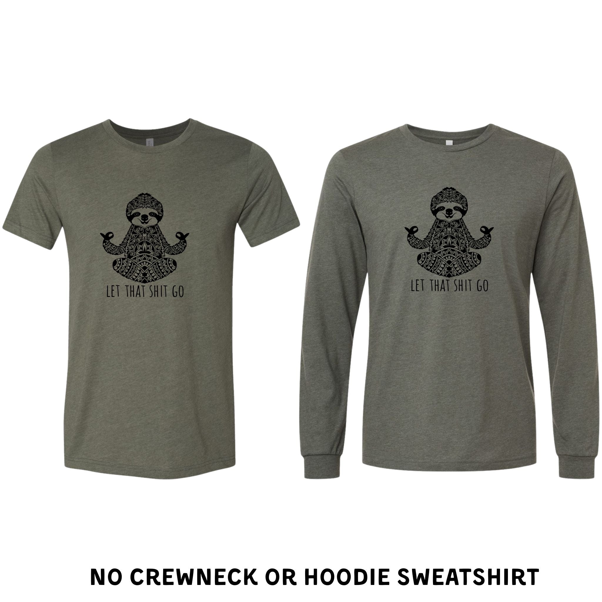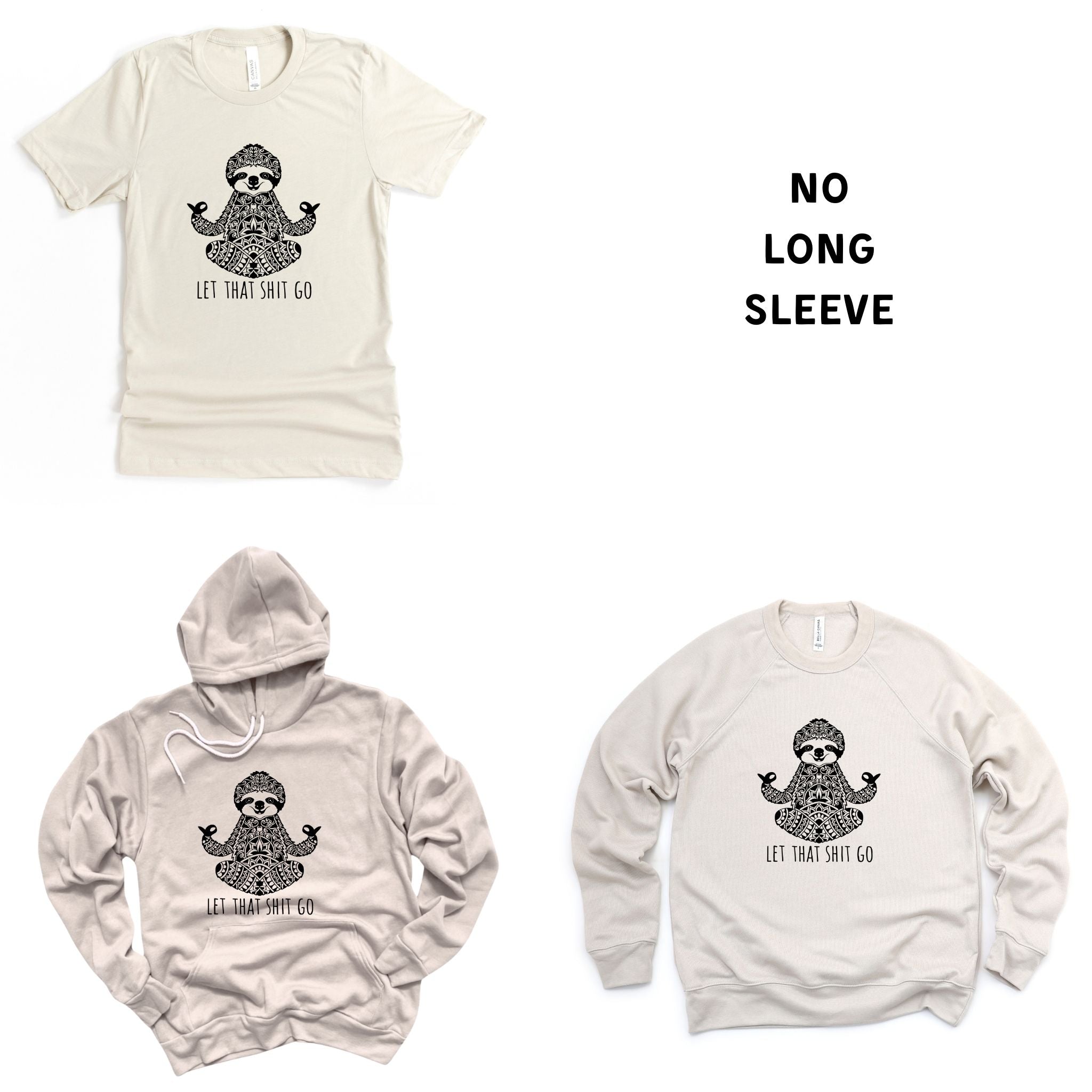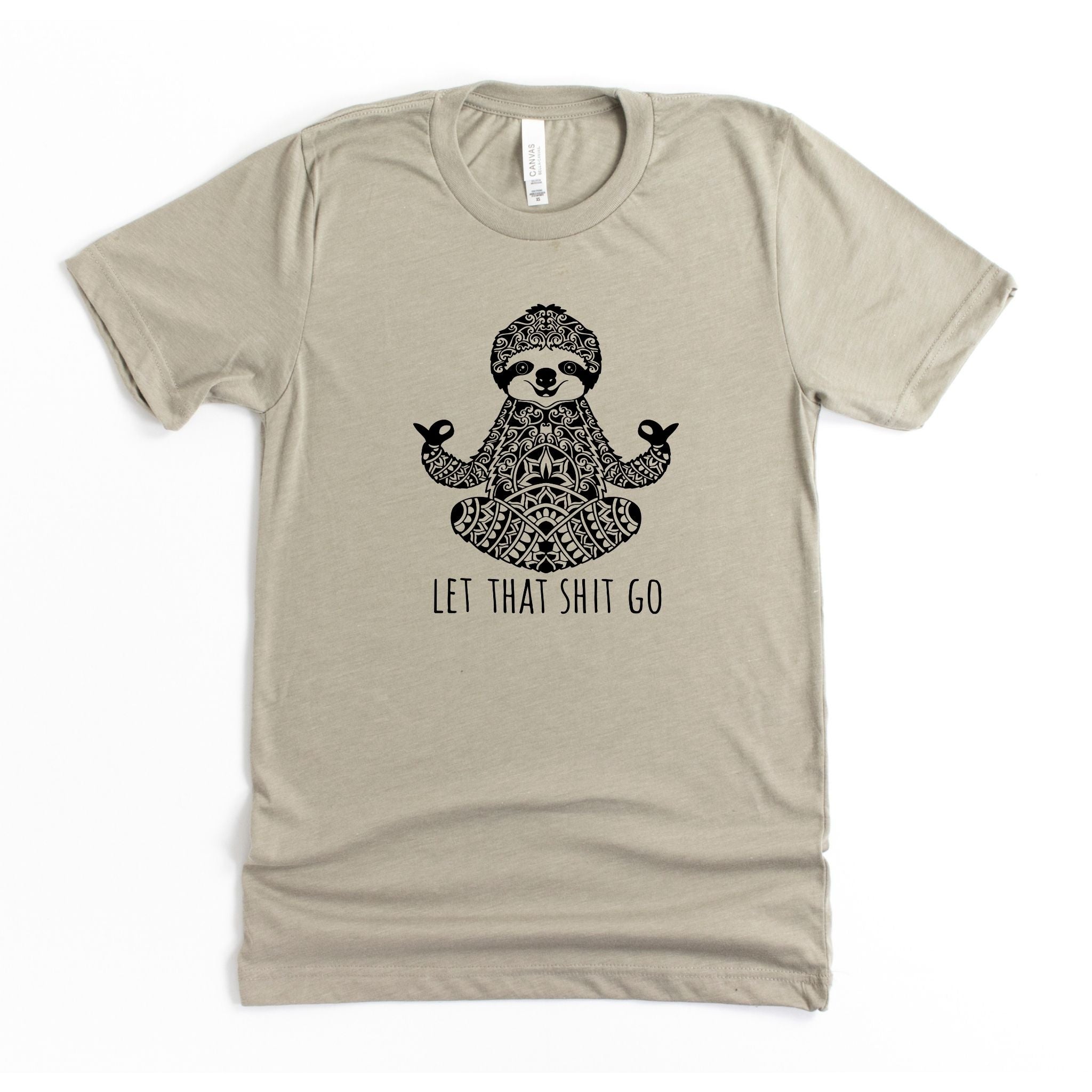 Keywords: sloth shirt, funny yoga tee, let that shit go, zen shirt, meditation tee, chill shirt, bella canvas, 208tees, unisex long sleeve, yoga humor, relax tee, funny sloth