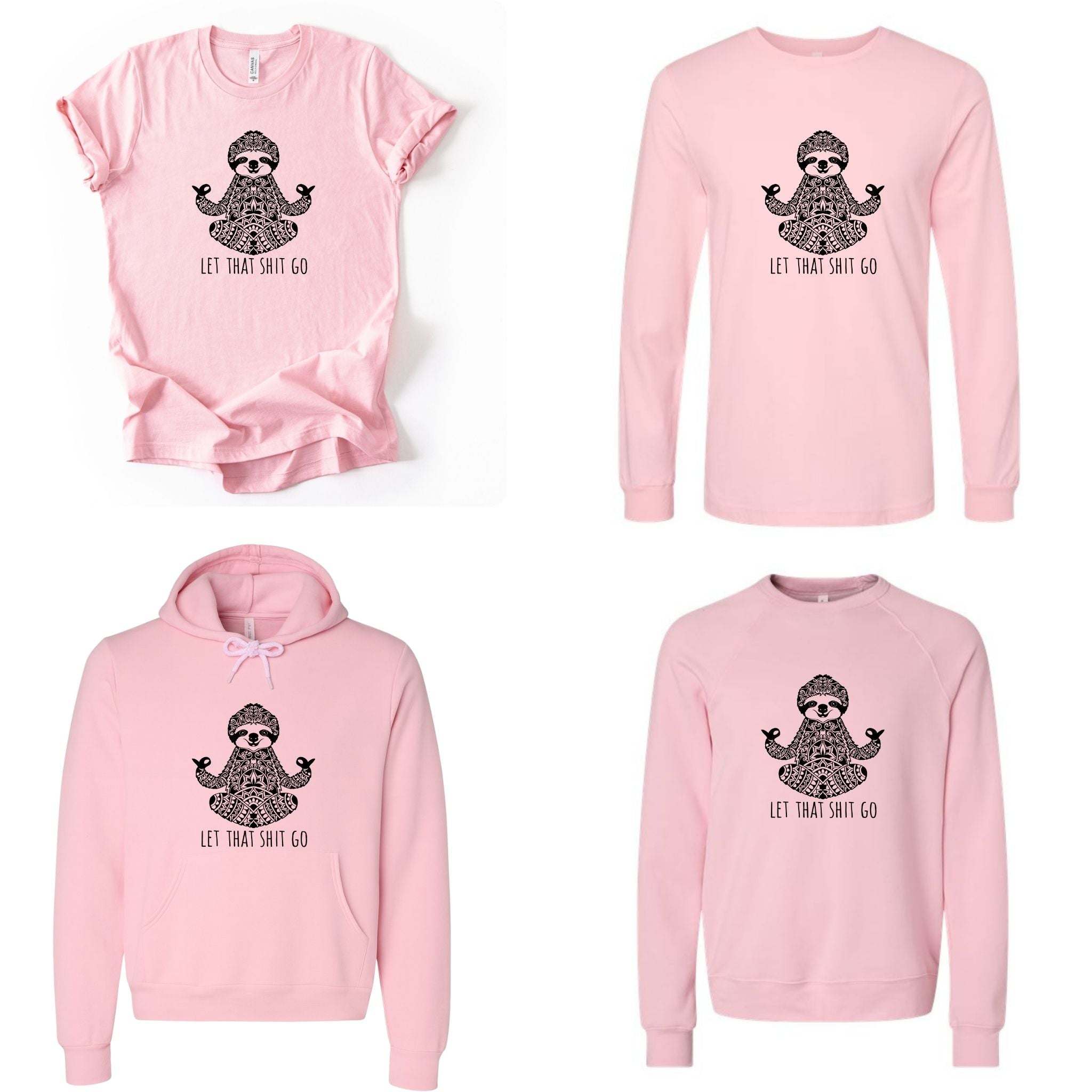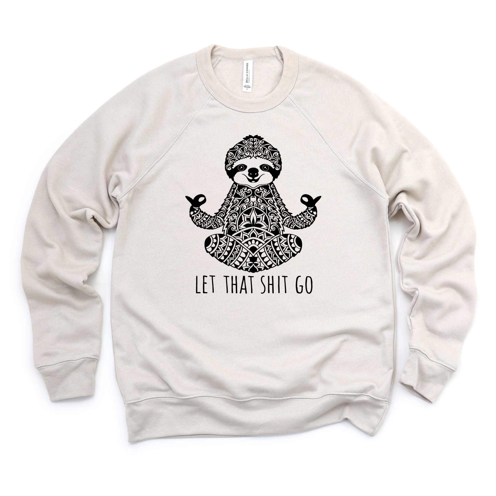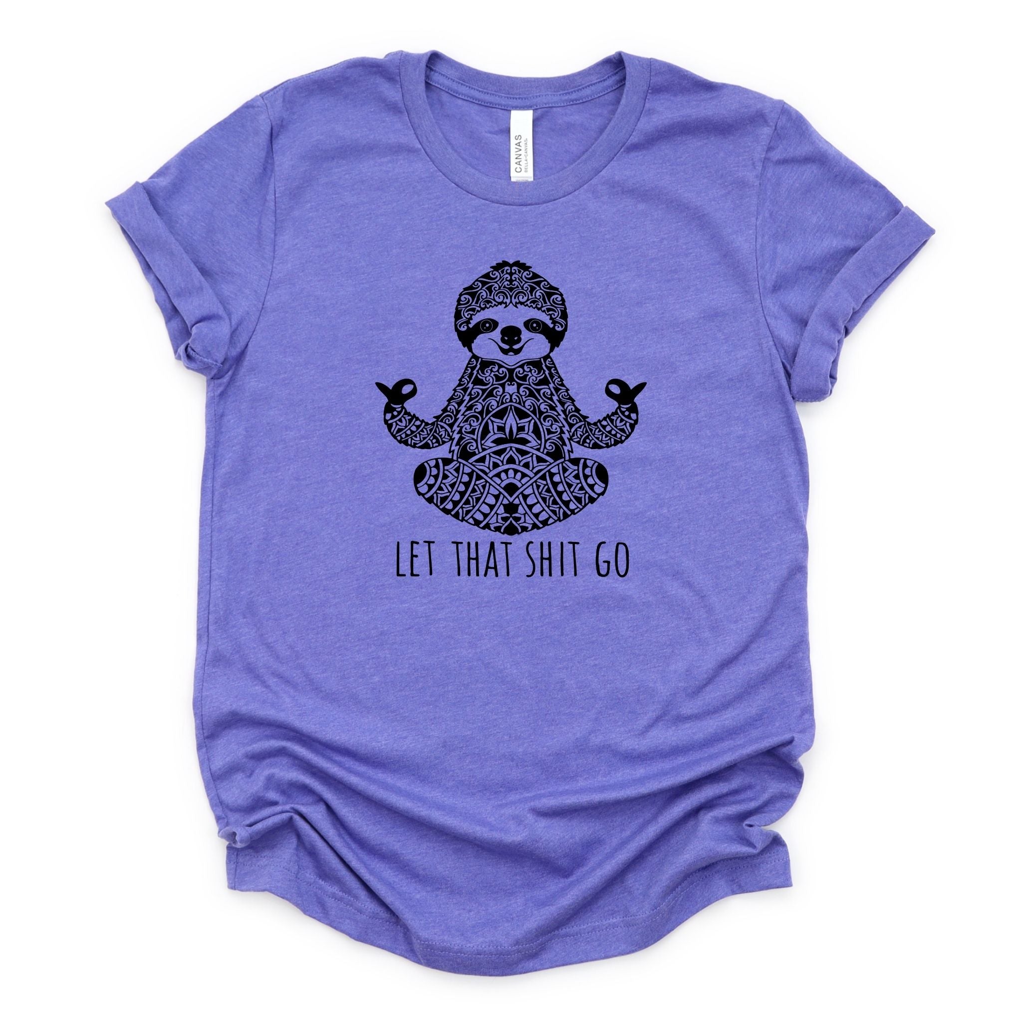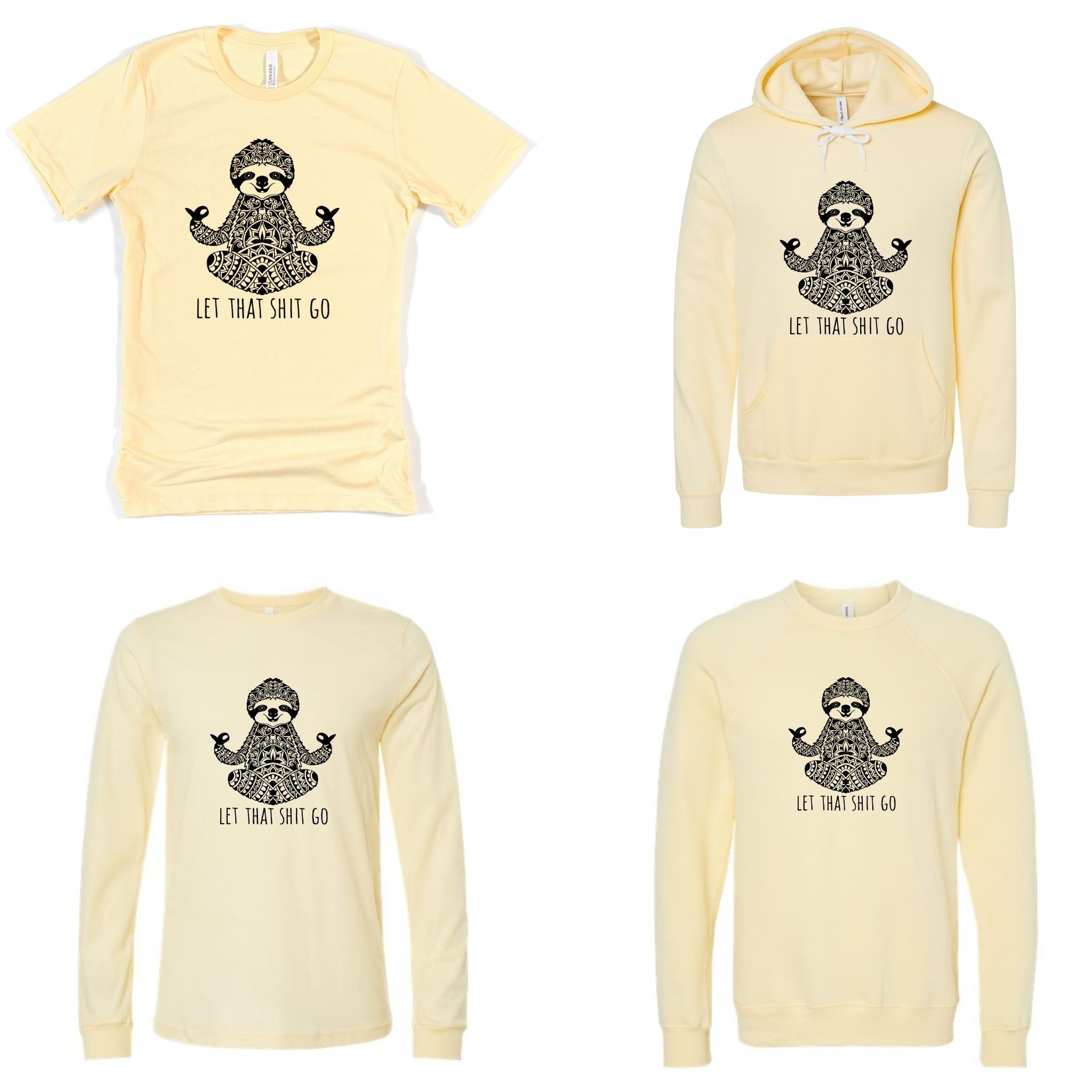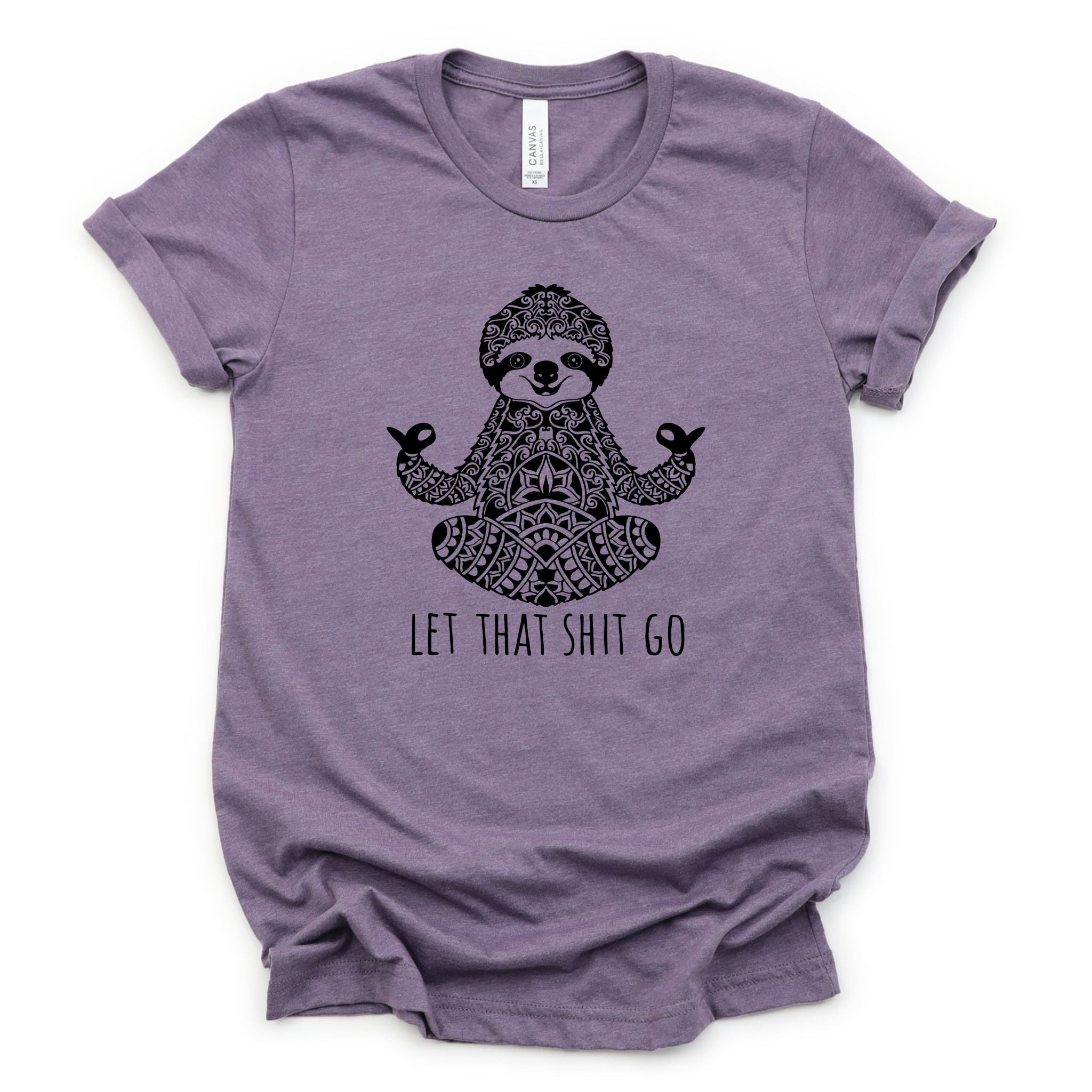 Keywords: sloth shirt, funny yoga tee, let that shit go, zen shirt, meditation tee, chill shirt, bella canvas, 208tees, unisex long sleeve, yoga humor, relax tee, funny sloth