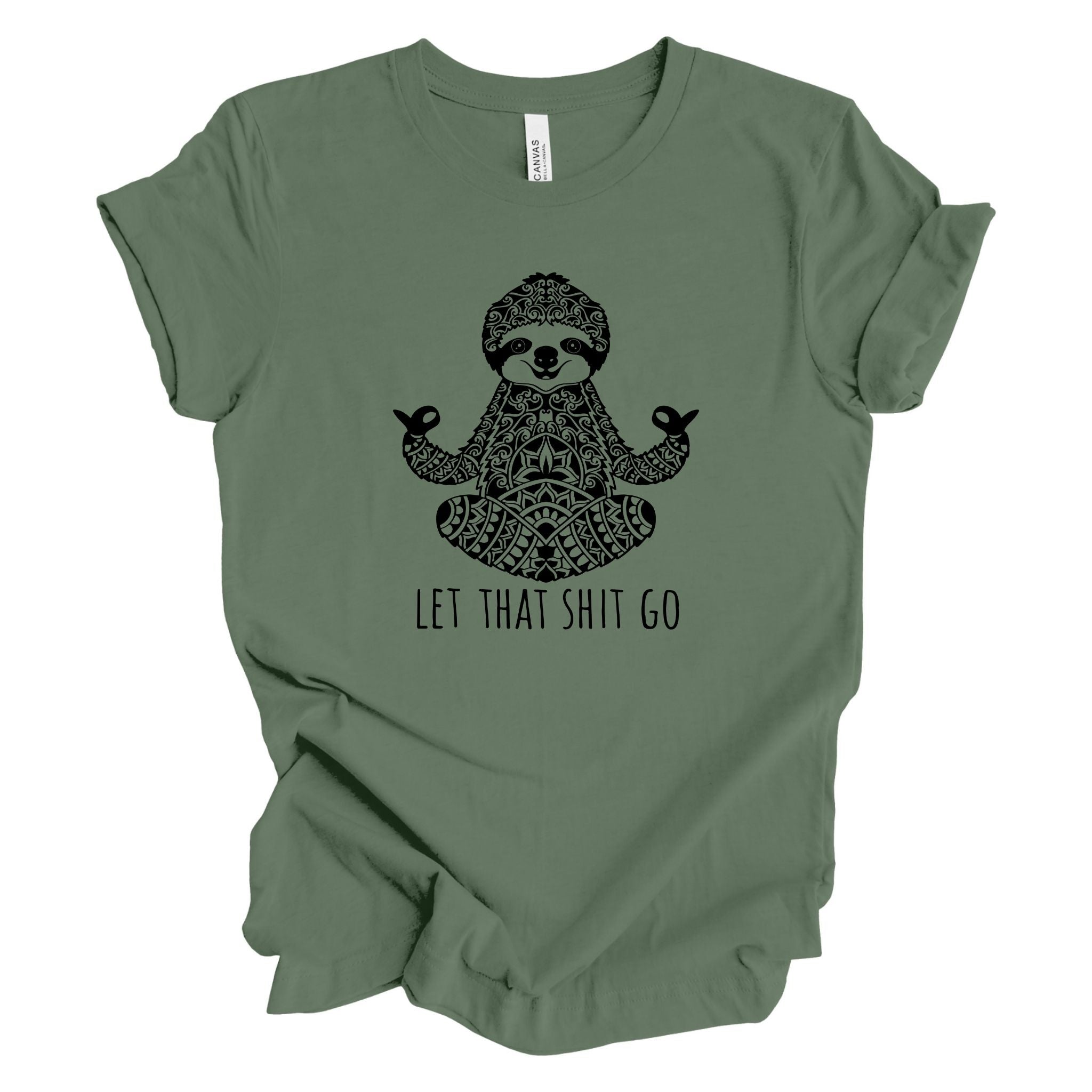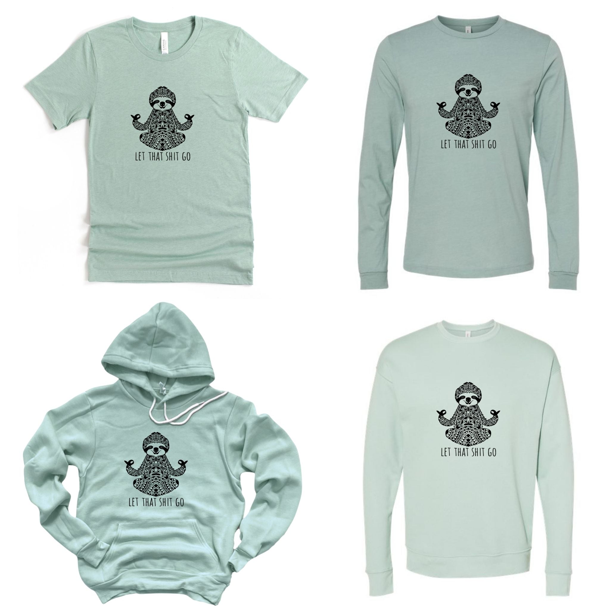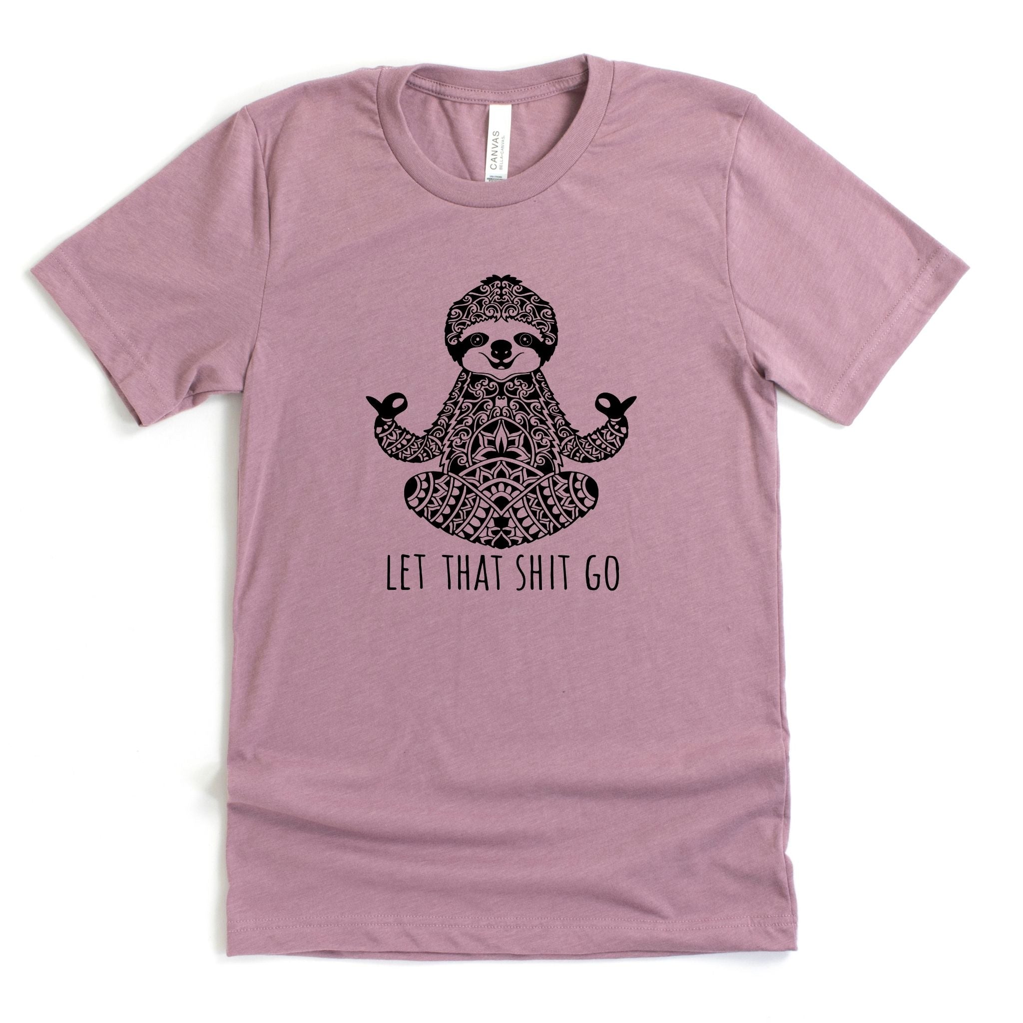 Funny Let That Shit Go sloth shirt featuring a meditating sloth and yoga-inspired humor. Hand screenprinted in North Idaho on soft Bella + Canvas tees and long sleeves β the perfect chill-out gift or daily reminder to relax.