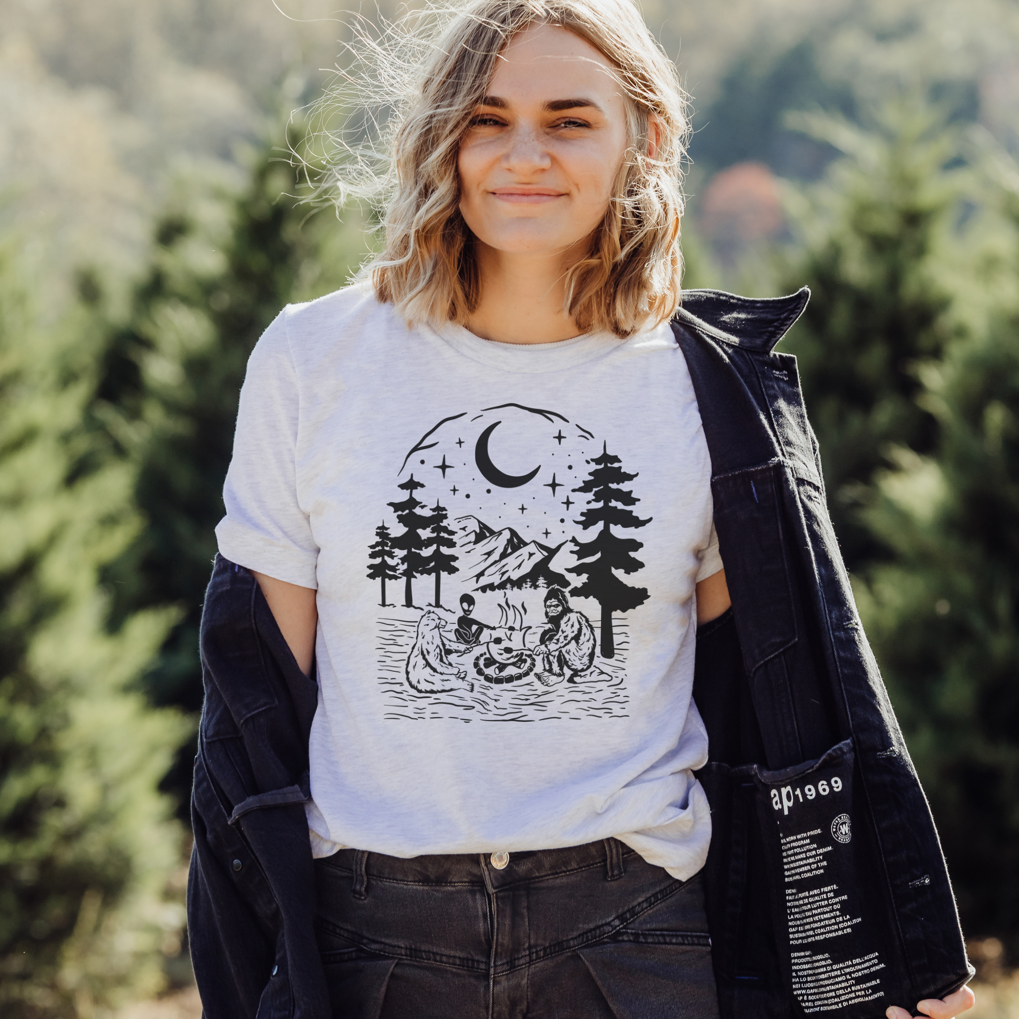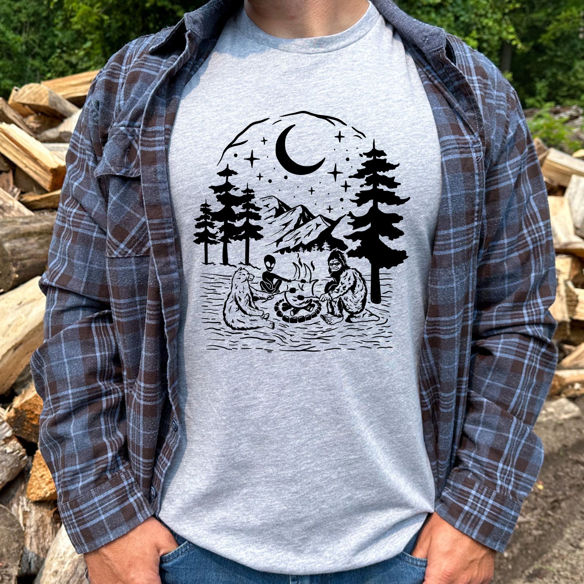 This graphic tee features a bear, an alien, and Sasquatch camping together in the forest, blending outdoor adventure with cryptid humor and a touch of the unexpected. Fun, imaginative, and inspired by nights around the campfire, this design is perfect for campers, Bigfoot believers, and anyone who loves quirky nature art.