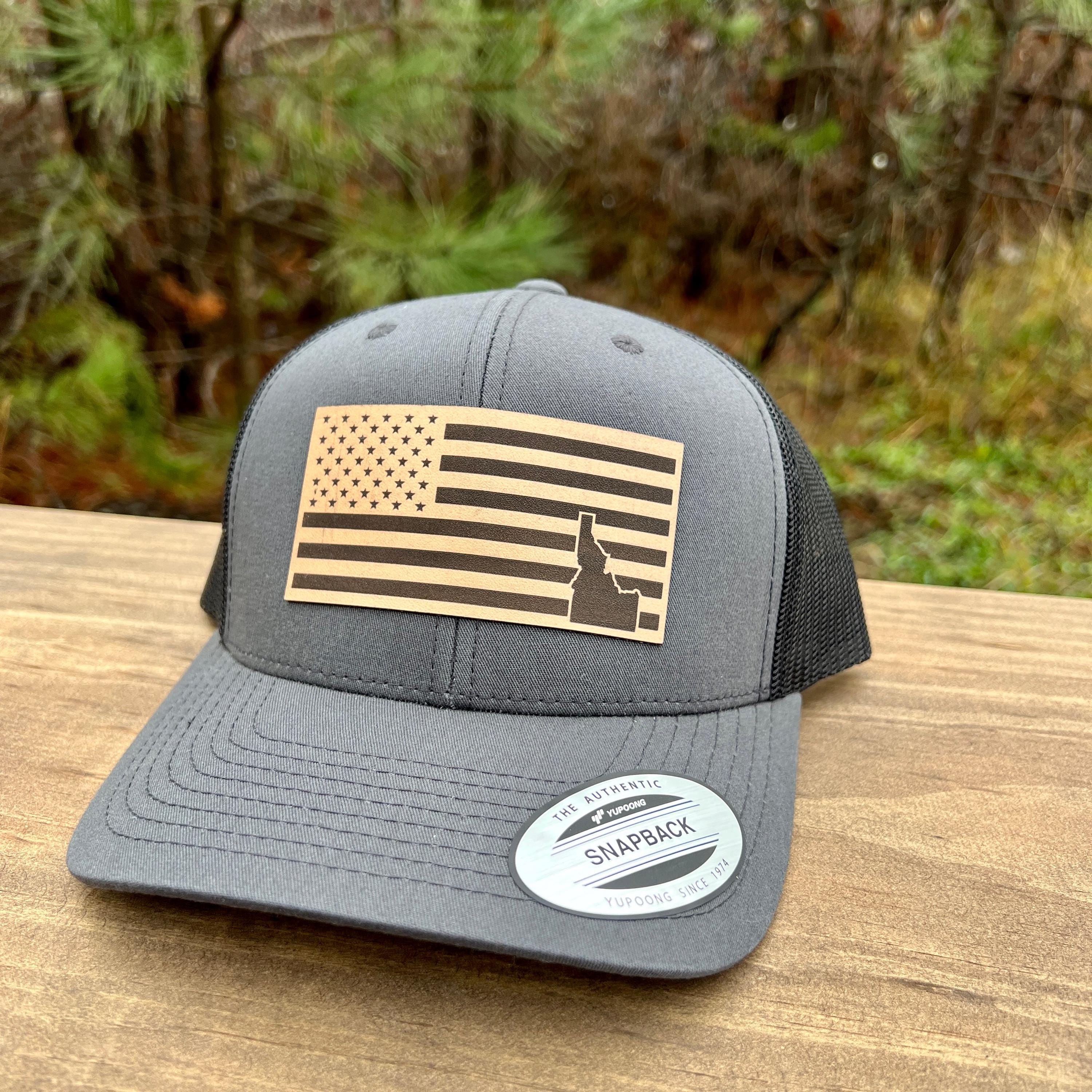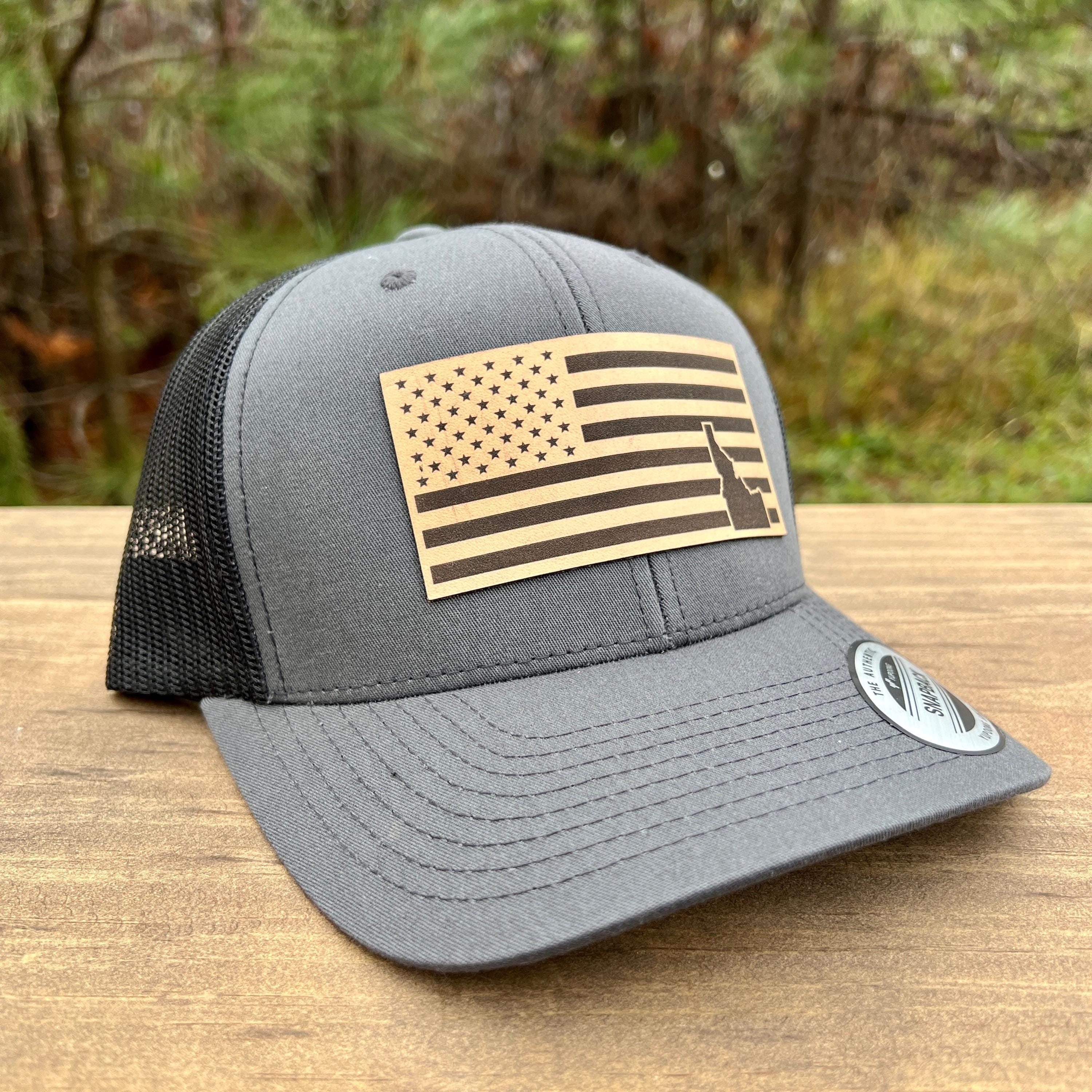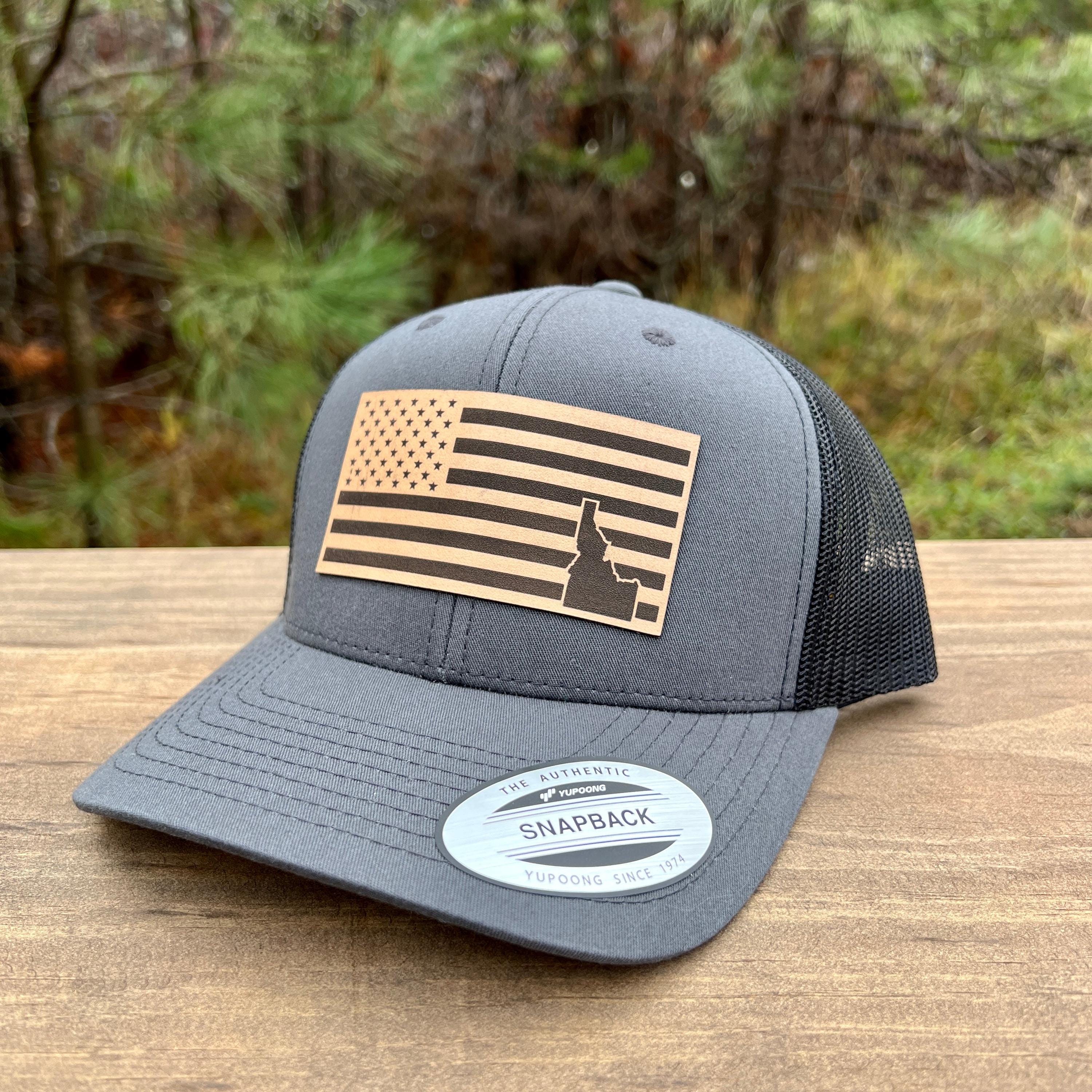 This handcrafted leather patch hat features a bold American flag design with the iconic shape of Idaho placed in the bottom right corner. Rugged, patriotic, and cleanly designed, this hat is perfect for Idaho locals, outdoorsmen, travelers, and anyone who loves unique state-pride gear with an American twist. Made with premium materials, it’s built for everyday adventure.