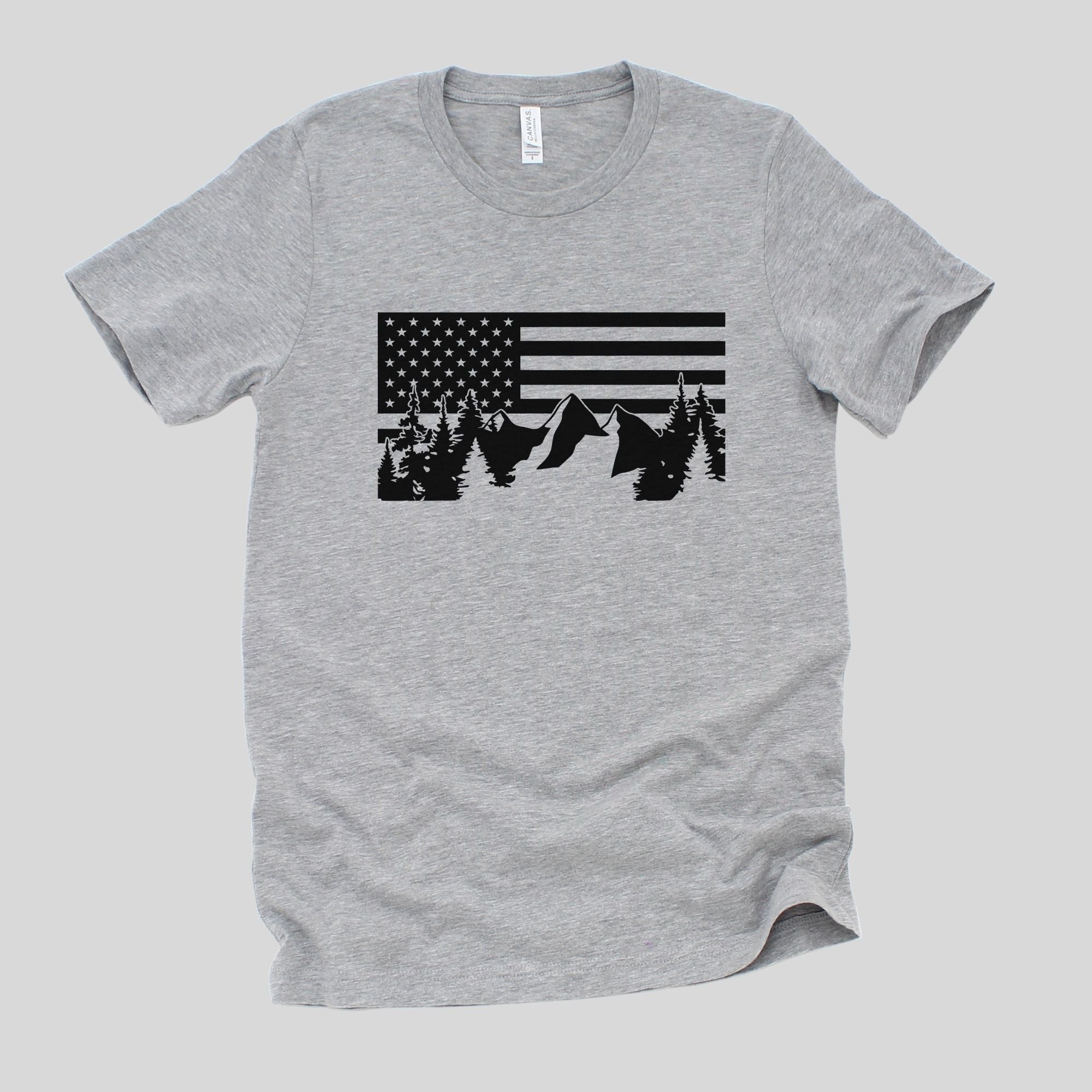 Celebrate the great outdoors with this unisex Nature Flag TShirt. Featuring an American flag design with scenic mountains and trees, it's perfect for any nature lover. Show off your love for the land with this quirky and playful tee.