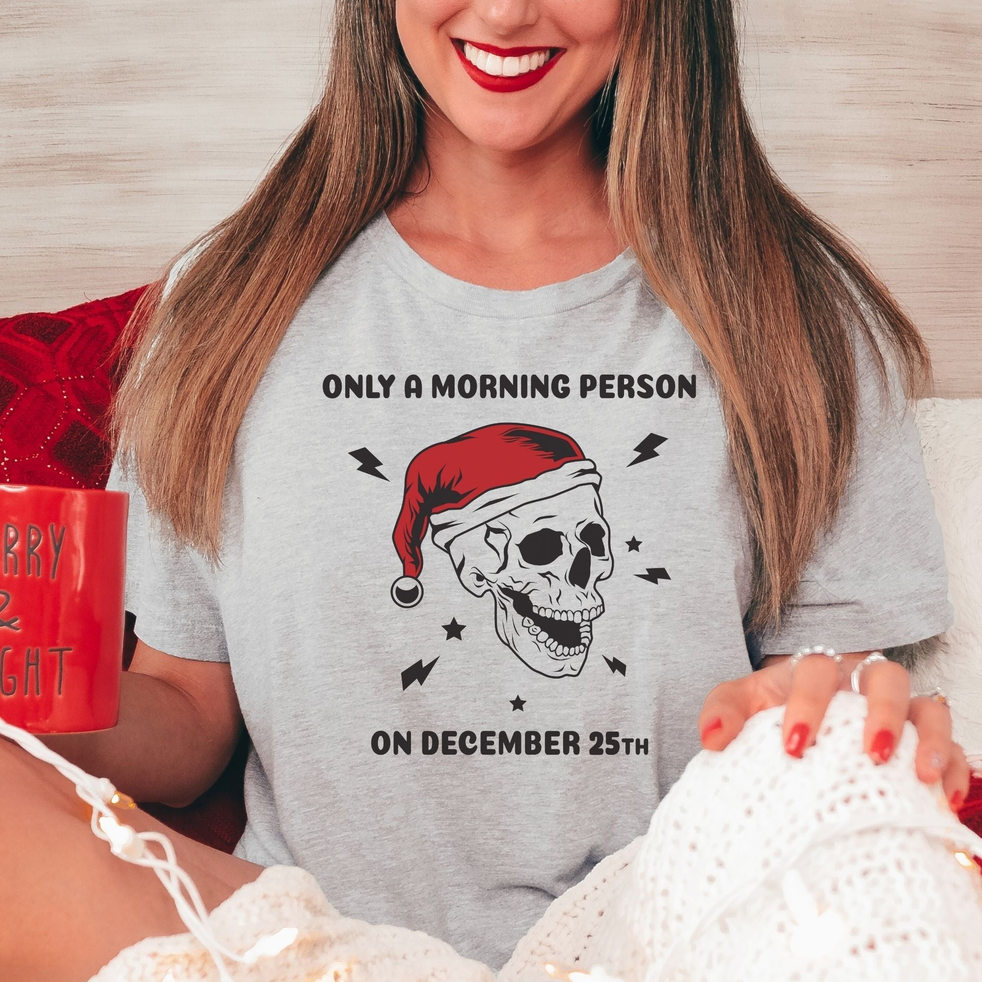 Get ready to spread some holiday cheer with this hilarious and cozy t-shirt! Crafted from ultra-soft fabric, this shirt is perfect for those who love comfort and laughter. Featuring a quirky skeleton donning a Santa hat, it hilariously states, "Only a morning person on December 25th." This funny Christmas shirt is bound to be a hit at festive gatherings or as a witty gift for friends and family. Embrace the Christmas spirit while enjoying the unmatched comfort of this super soft tee. It's the perfect way to show off your unique sense of humor and spread some festive joy this holiday season.