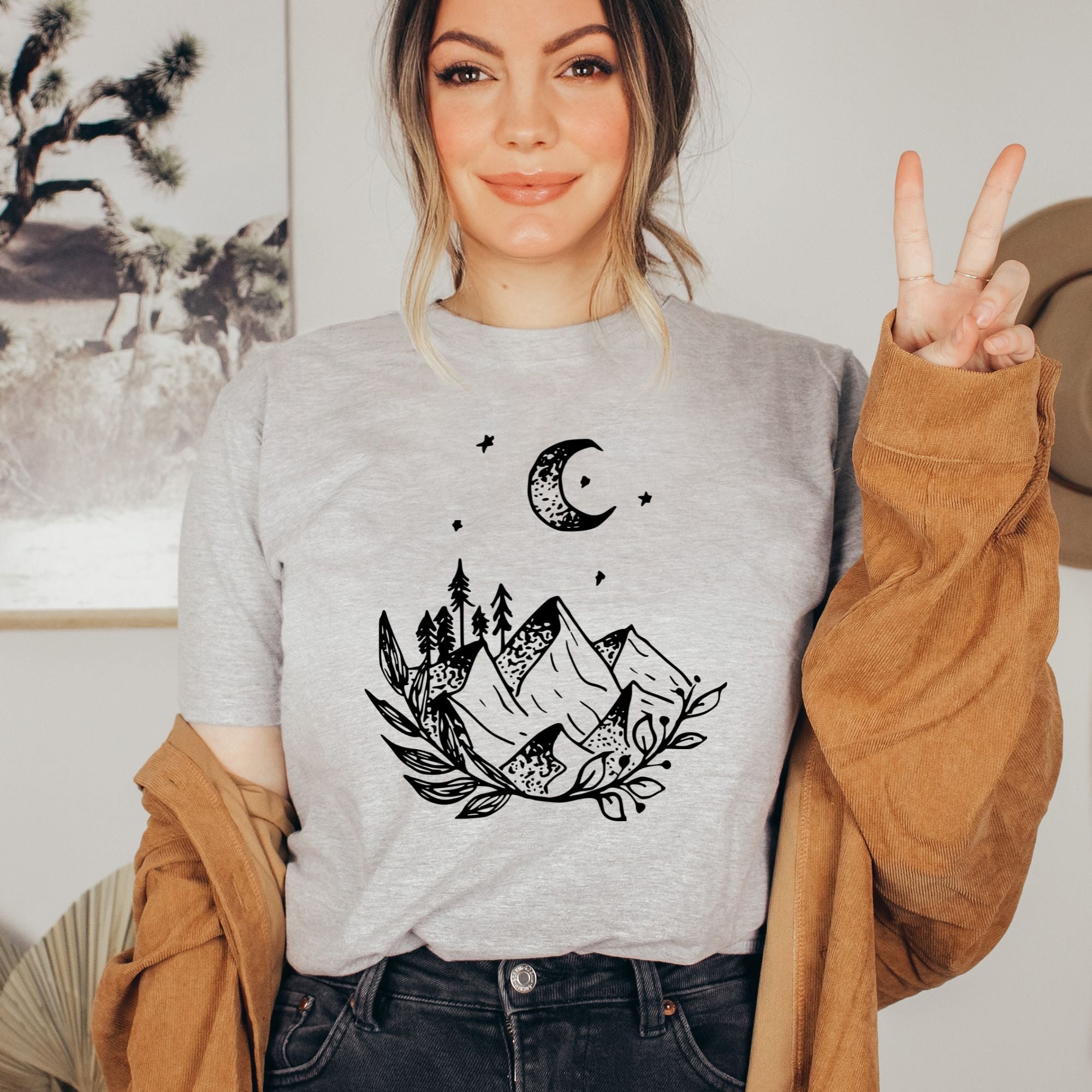 The Starry Night TShirt for Women is designed for outdoor adventurers. It combines a buttery soft feel with superior durability and a stylish nature-inspired graphic. With its moisture-wicking and breathable material, it is perfect for hikes, camping, or even just a casual day out. Enjoy comfort and looks with this shirt.