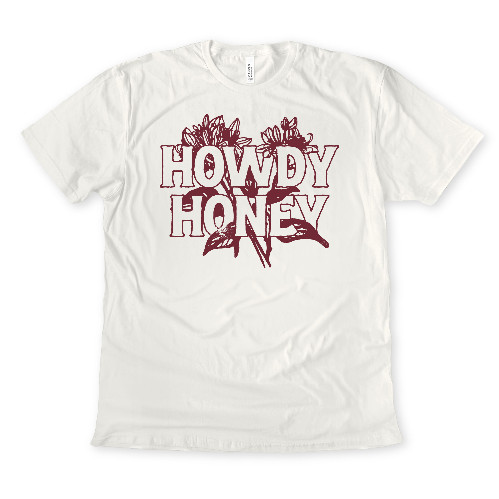 howdy honey tee, western graphic tee, floral t-shirt, country girl shirt, cowgirl aesthetic, rodeo outfit, southern charm, cute western tee, simple graphic tee, casual country fashion, fair outfit idea, southern belle style, cotton graphic tee, floral print shirt, western vibes