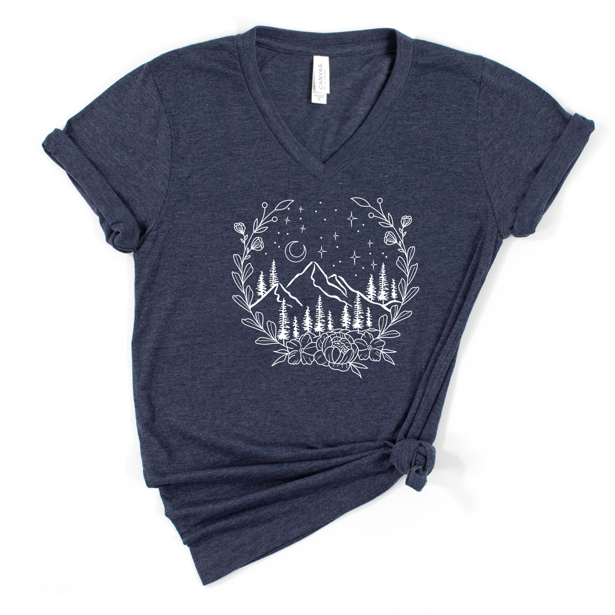This floral nature graphic shirt features a hand drawn mountain scene with stars and a detailed floral border for a dreamy, outdoorsy vibe. Designed for nature lovers, this graphic tee or tank top blends boho style with celestial and mountain-inspired artwork. Perfect for everyday wear, this floral mountain shirt pairs effortlessly with casual outfits and layered looks. A great boutique graphic tee for fans of hand drawn art, nature scenes, and unique outdoor apparel.
