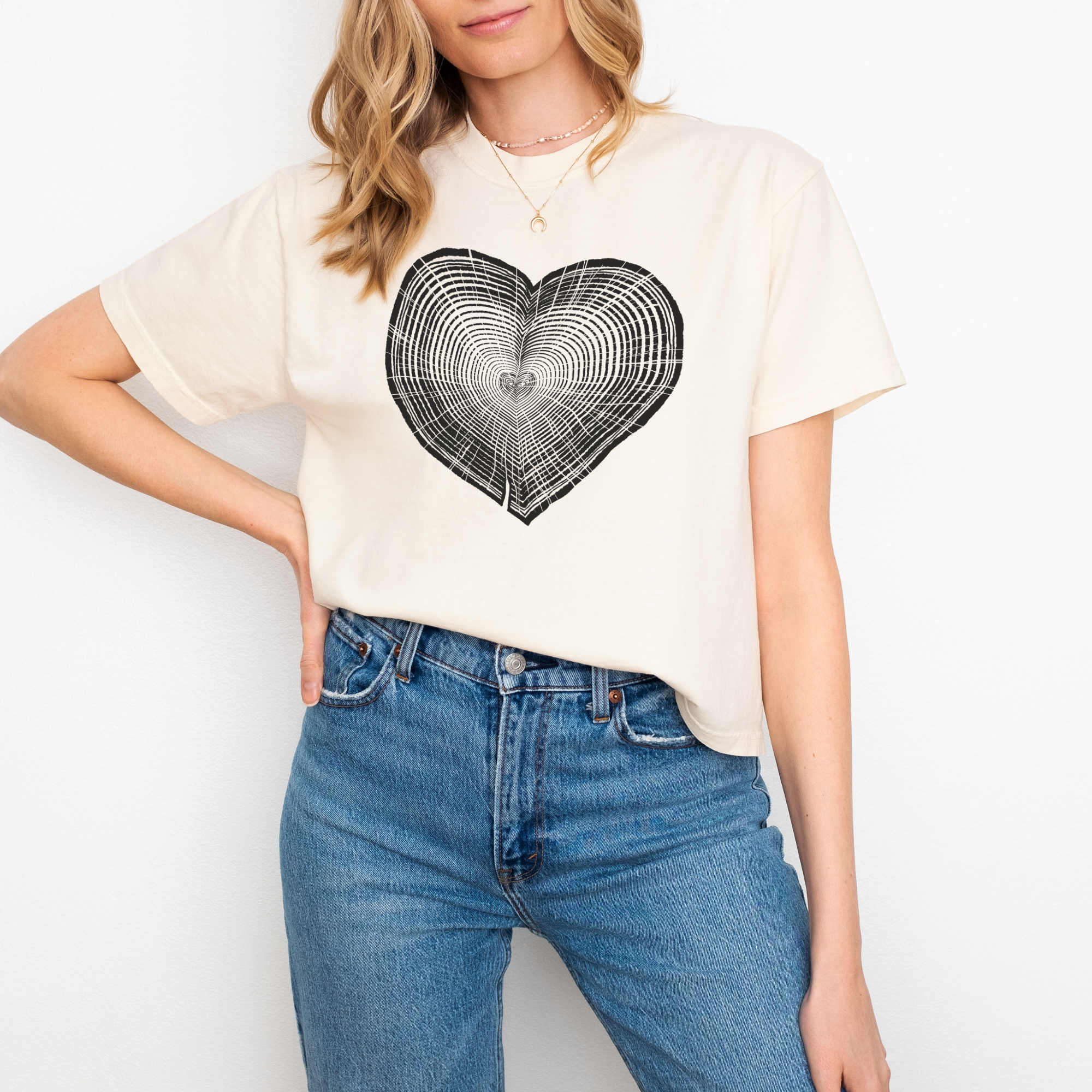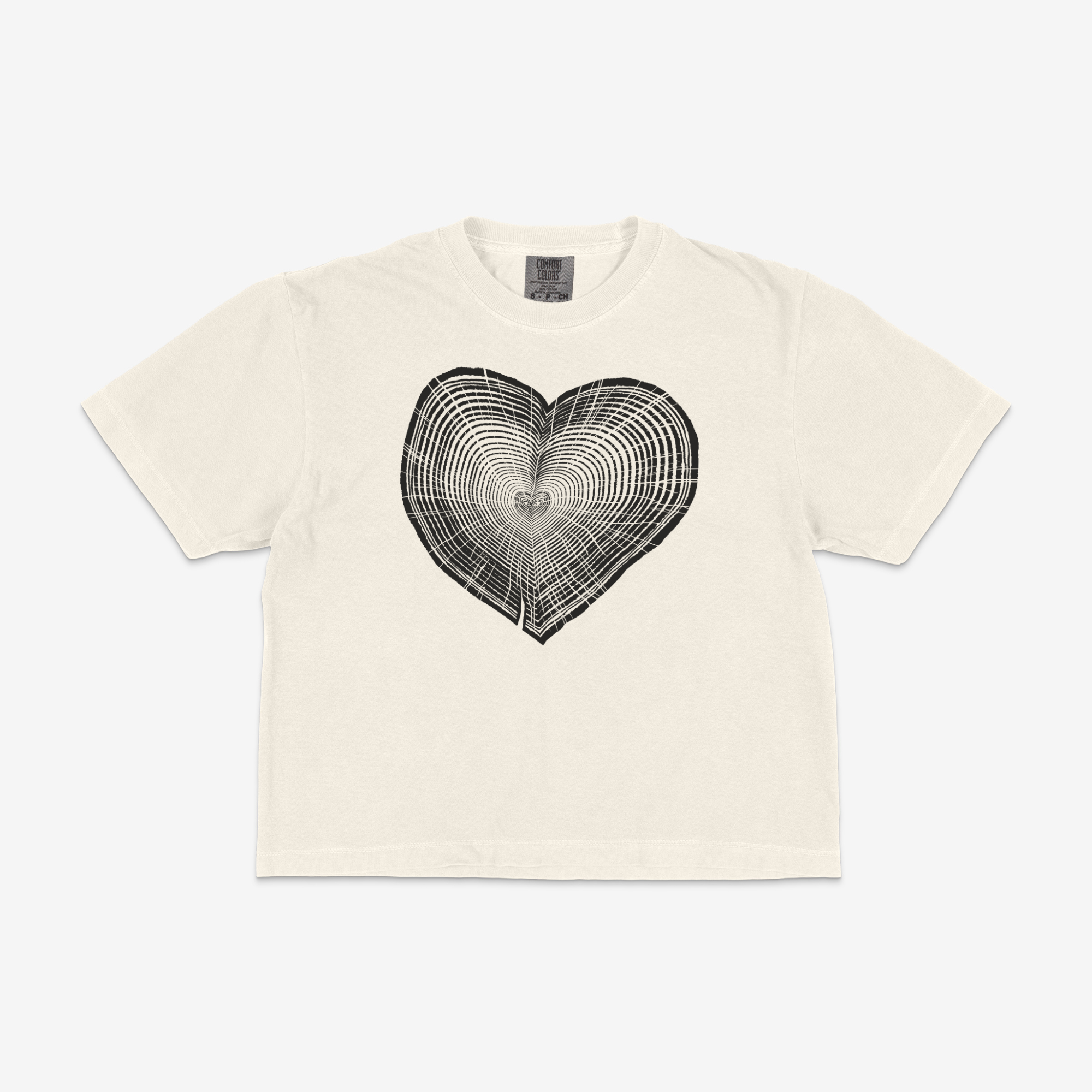 heart tree shirt, tree ring heart tee, cropped graphic tee, nature cropped top, forest graphic shirt, tree slice shirt, outdoor graphic tee, boho nature shirt, womens cropped tee, nature lover shirt, boutique graphic tee, eco inspired shirt, cute nature top