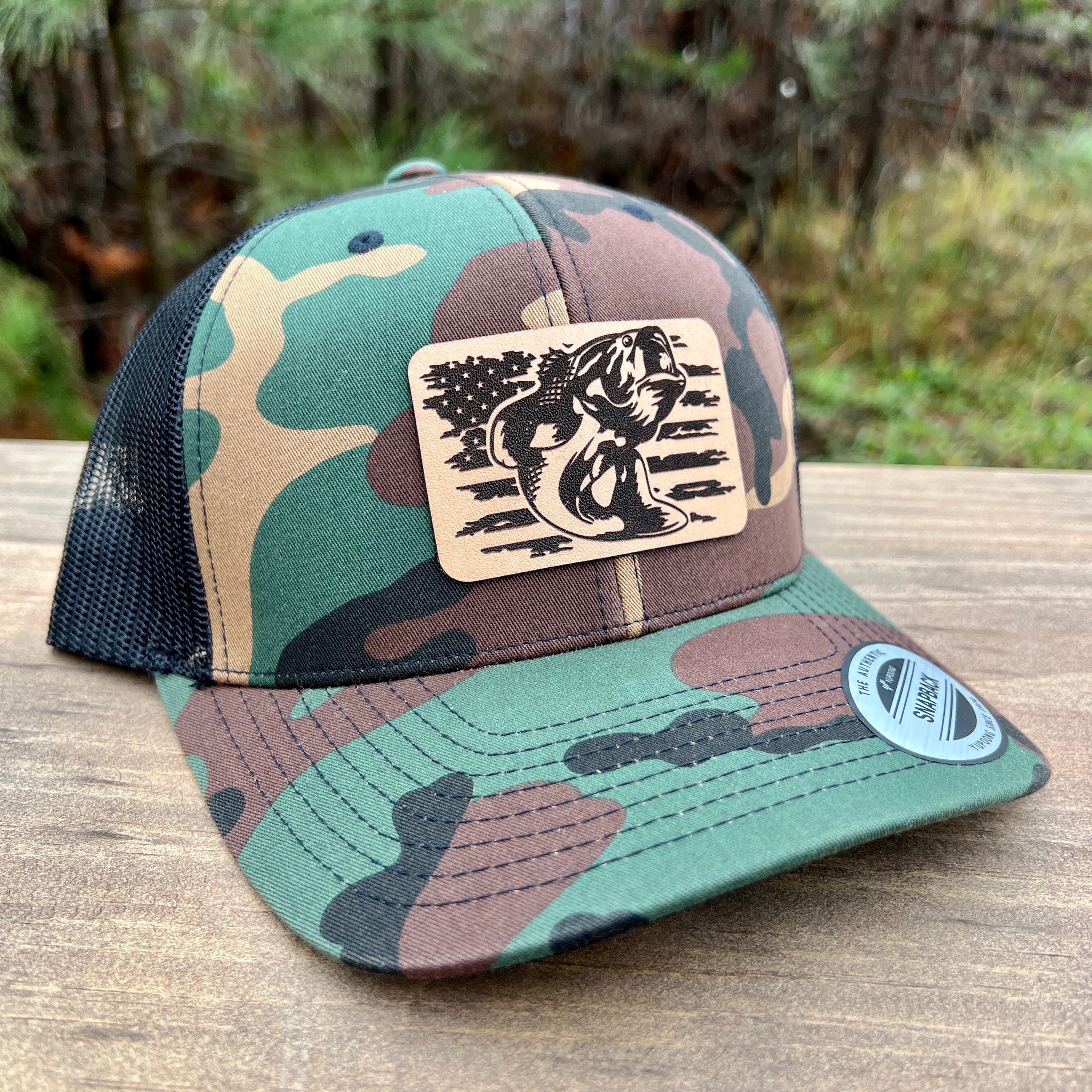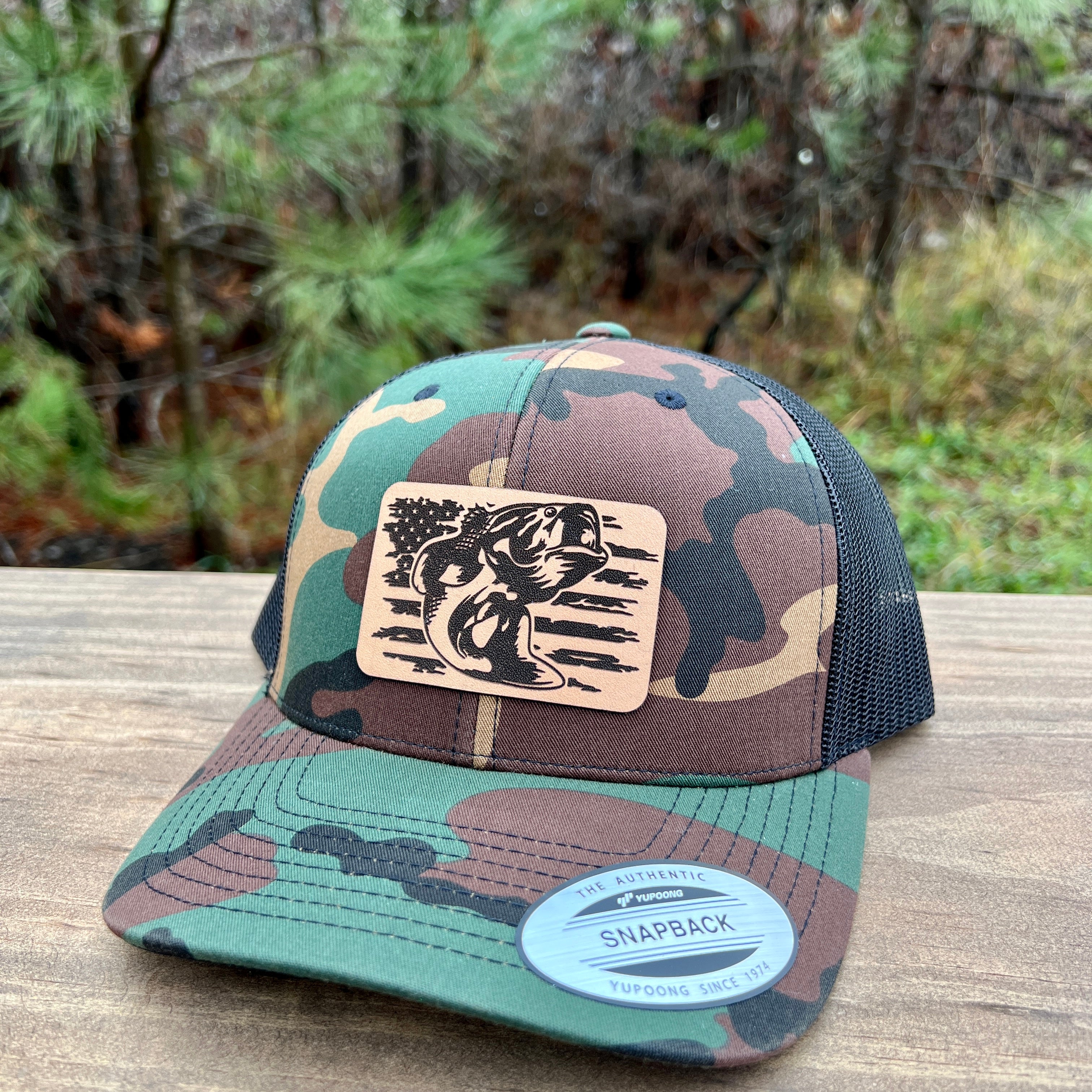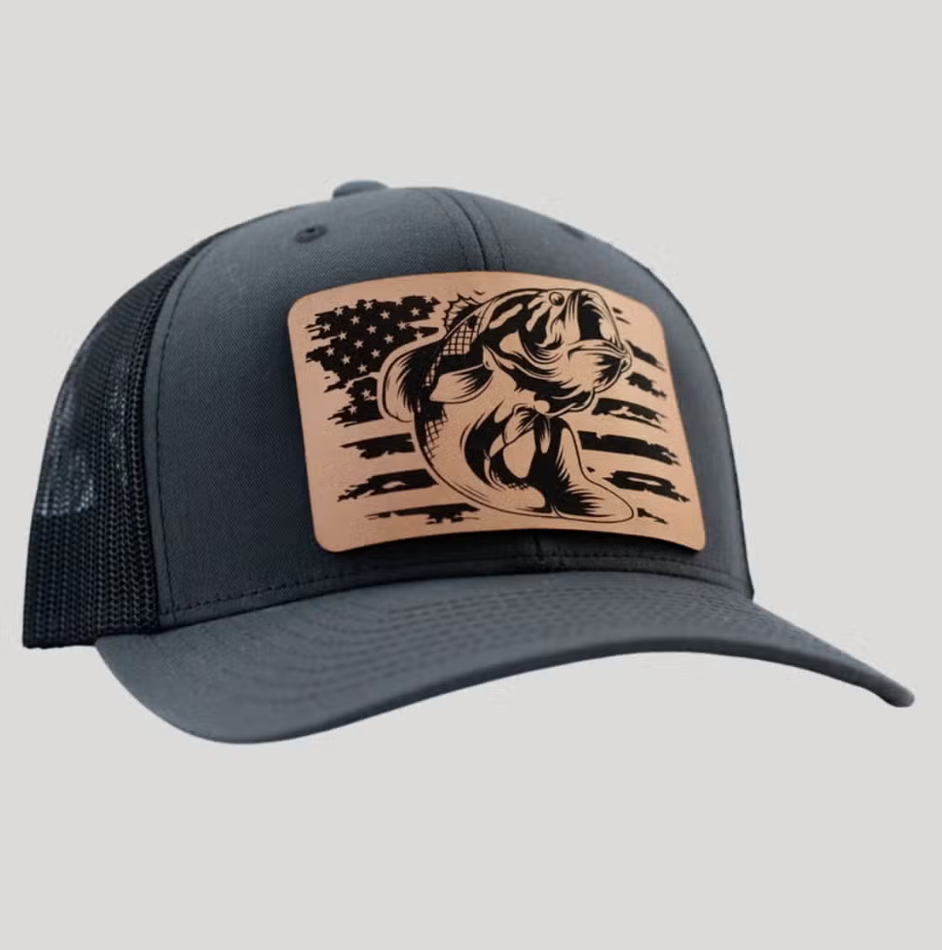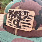 This snapback trucker hat blends style and patriotism, making it the perfect accessory for the avid fisherman with a love for their country. The hat features a leather patch adorned with a beautifully engraved bass fish, capturing the essence of fishing. The distressed American flag in the background adds a touch of vintage charm, symbolizing your unwavering patriotic spirit. Crafted with quality materials, this hat offers a comfortable yet durable fit, ensuring it stands the test of time on all your fishing adventures. Wear your pride on your head with this one-of-a-kind snapback trucker hat.