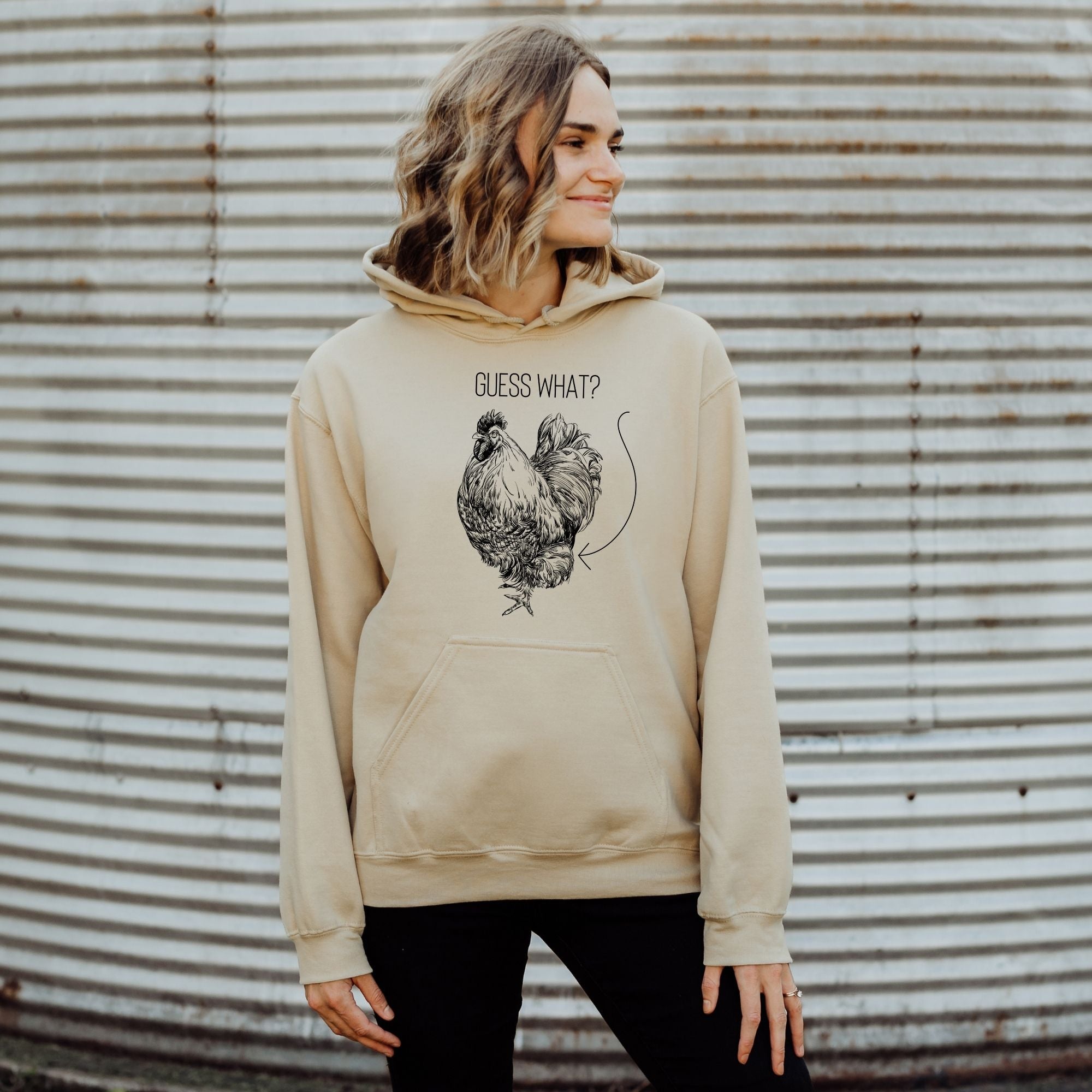 This ultra-soft sweatshirt is the ultimate blend of cozy comfort and hilarious style! Featuring a playful hand-drawn hen design with the words "guess what" and a cheeky arrow pointing to the chicken's backside, this shirt is a witty nod to the classic dad joke. Made from premium quality fabric, it guarantees maximum snugness and durability. Perfect for lounging at home or adding a humorous touch to any casual outfit, this sweatshirt will surely spark laughter and endless conversation. Embrace the lighthearted humor and showcase your fun-loving personality with this cheeky hen sweatshirt!