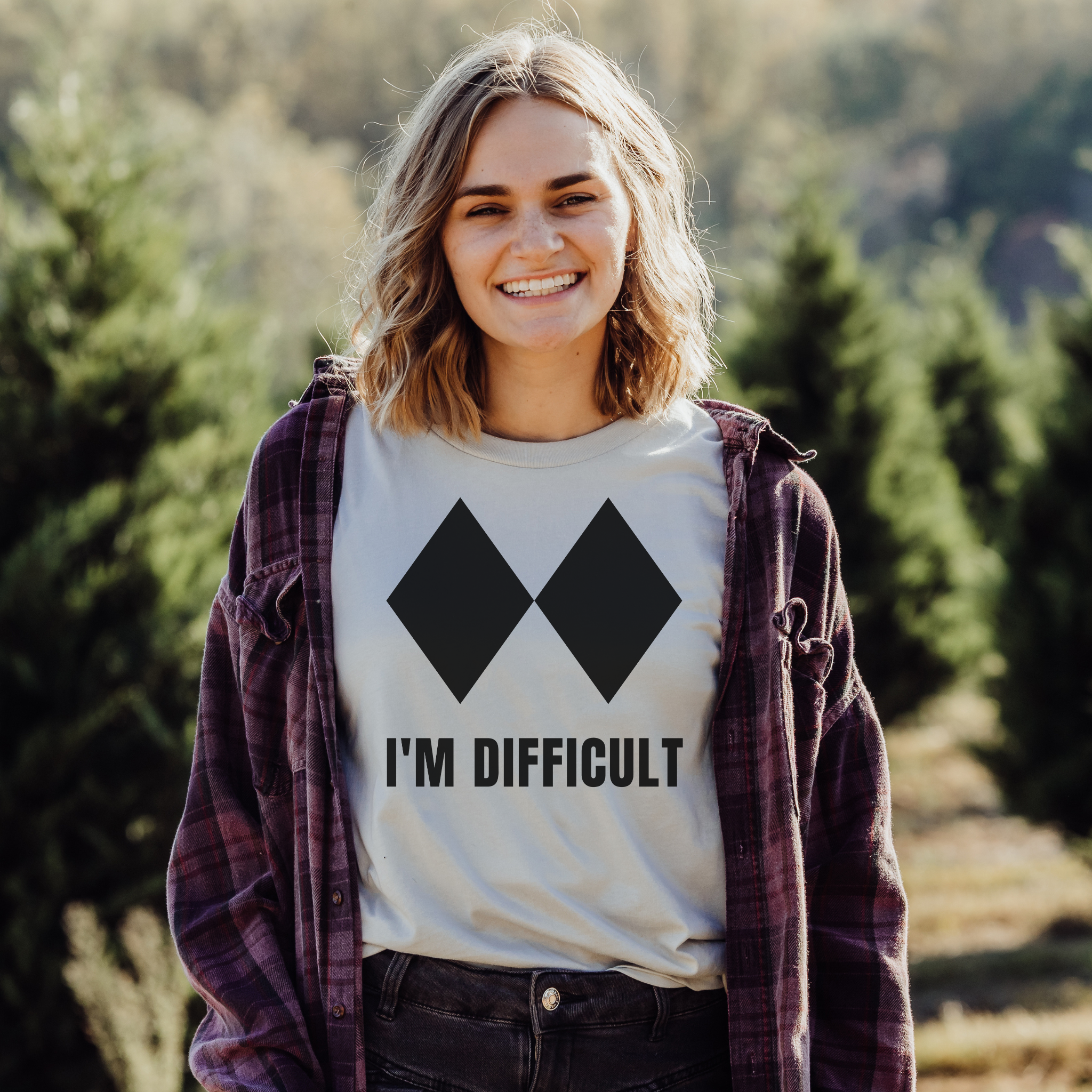 This graphic tee features double black diamond symbols paired with the words “I’m Difficult.” Inspired by ski culture and mountain humor, this design is perfect for those who embrace a challenge and wear it proudly—on the slopes or off.