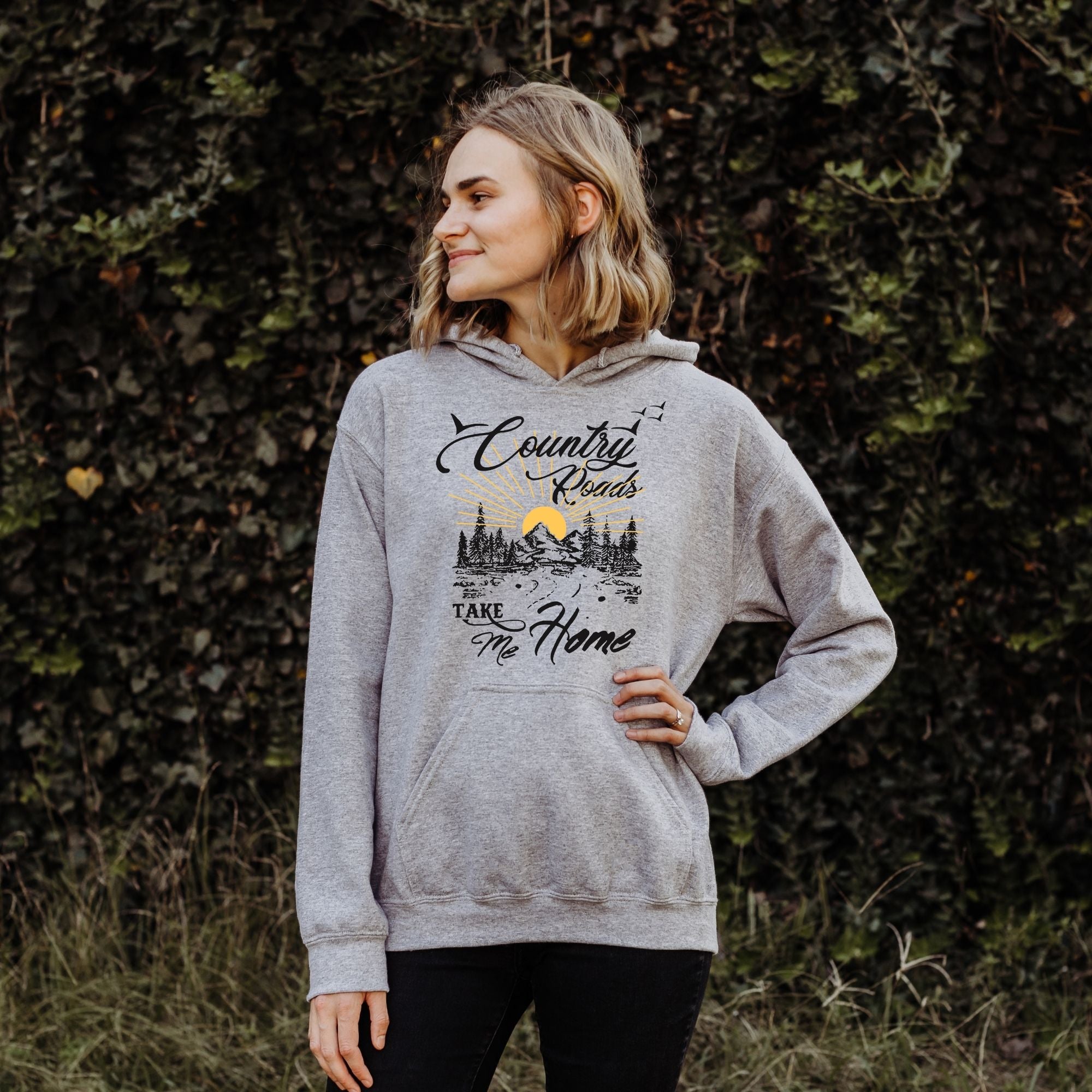 Introducing our cozy Country Roads sweatshirt, designed to wrap you in warmth and comfort wherever life's journey takes you. Crafted with the softest materials, this sweatshirt features a captivating design that will transport you to the peaceful serenity of a winding road. The mesmerizing sunset gently peeks behind majestic mountain. With the heartfelt words "Country Roads take me home," this sweatshirt evokes nostalgia and wanderlust, reminding you of the tranquility found in nature's embrace. Embrace your sense of adventure while staying snug and stylish in this must-have sweatshirt.