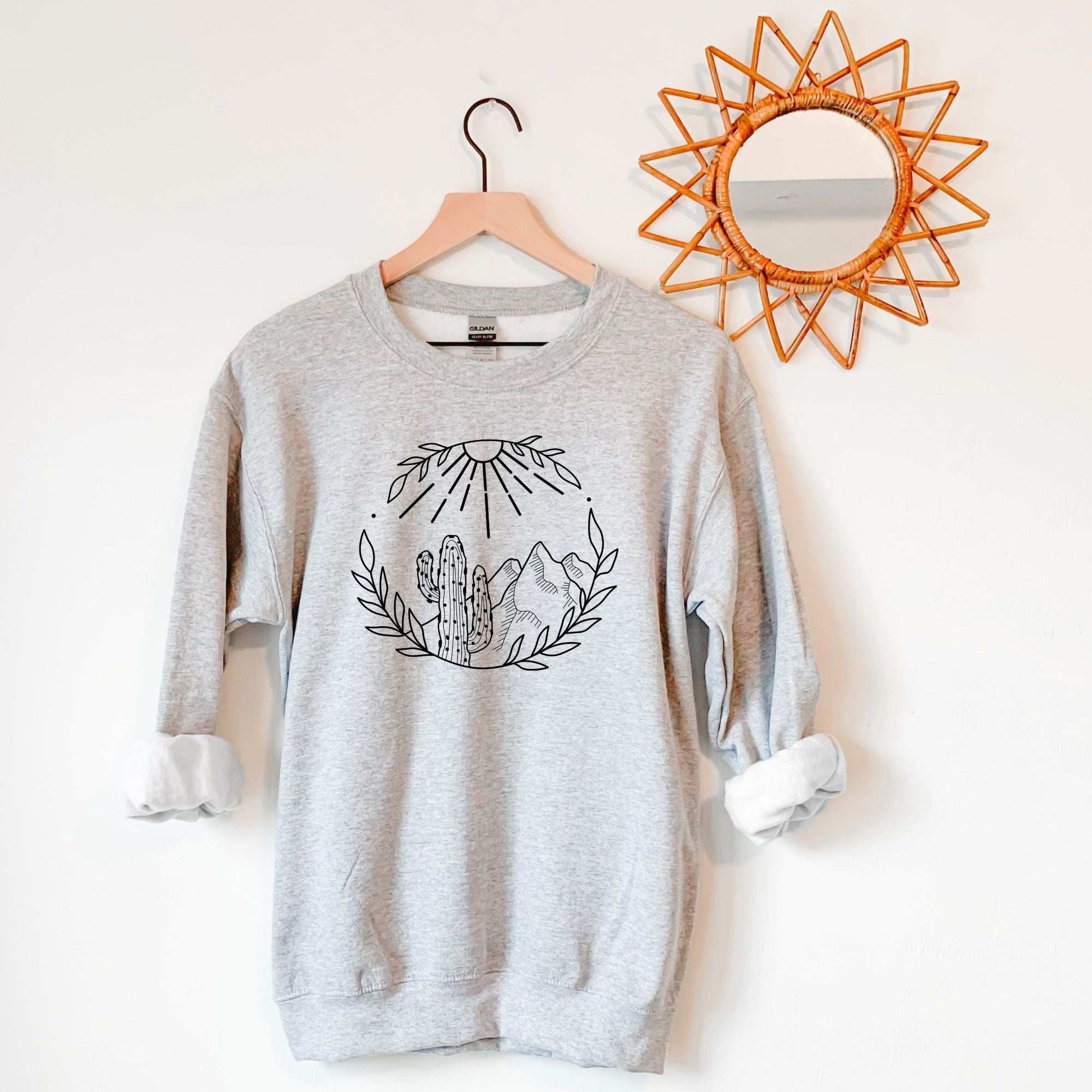 This Desert Scene Crewneck features a cactus graphic, available in either a sweatshirt or hoodie.