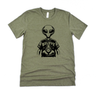 This graphic tee features an alien wearing a t-shirt with Bigfoot on it and the word “Believe,” blending UFO curiosity, cryptid culture, and playful humor. A fun nod to legends, mystery, and open minds, this design is perfect for Bigfoot believers, alien fans, and anyone who loves quirky graphic tees.
