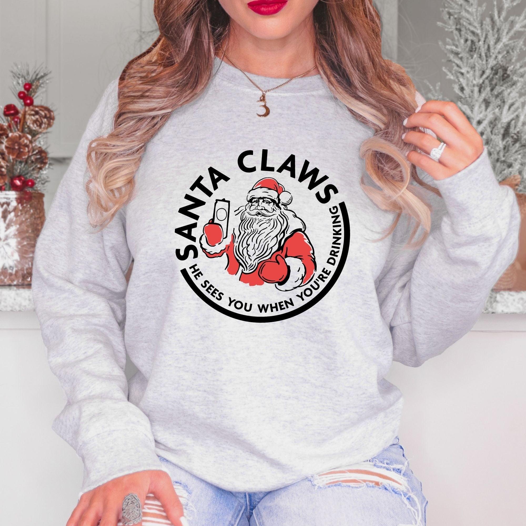 Stay Cozy and Festive with our Super Soft 'He Sees You When You're Drinking' Sweatshirt - A Lighthearted Twist on Holiday Cheer!