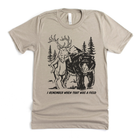 elk bear tee, funny nature tee, local humor shirt, wildlife graphic, outdoors humor, rustic graphic tee, forest humor, unisex nature tee, idaho made tee, screenprinted tee, country humor, simple graphic, premium cotton