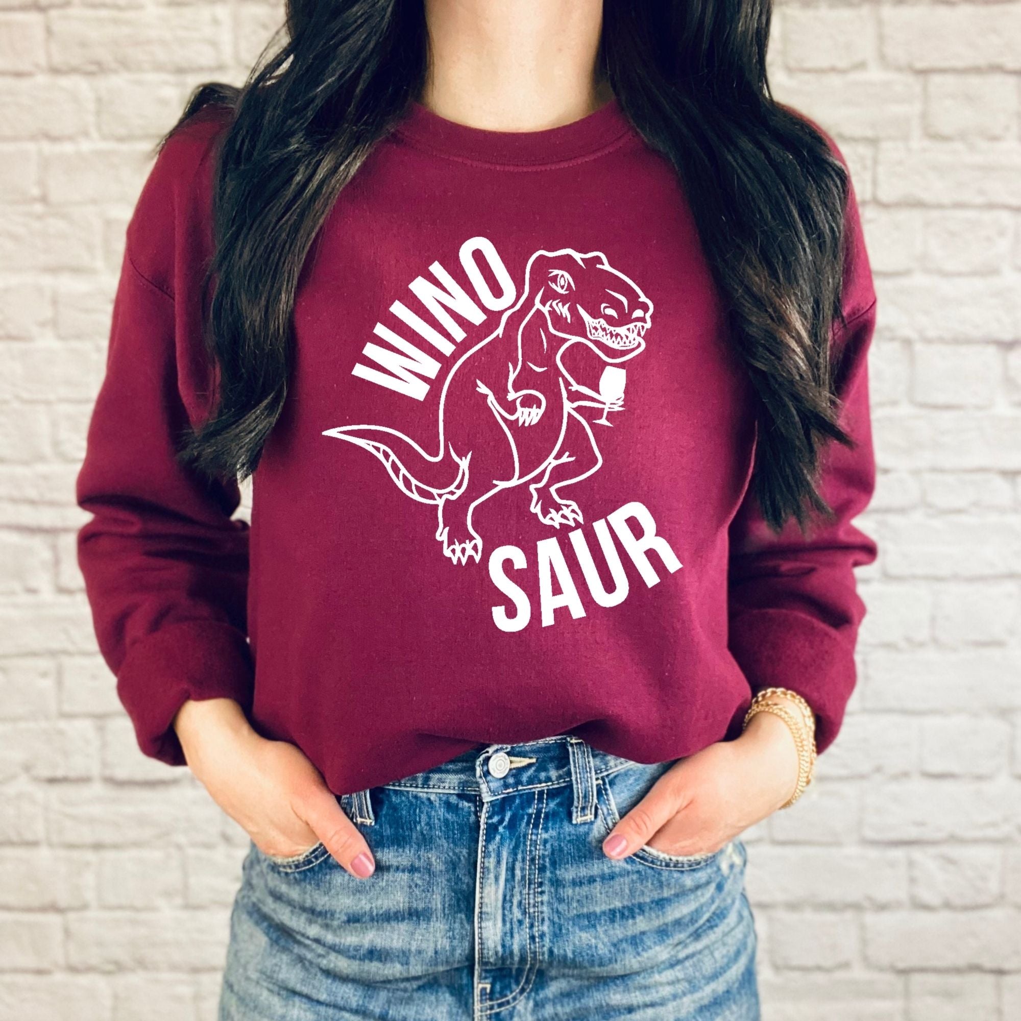 Get Cozy with the Trendy 'Winosaur': Unique Dinosaur Sweatshirt for Wine Lovers